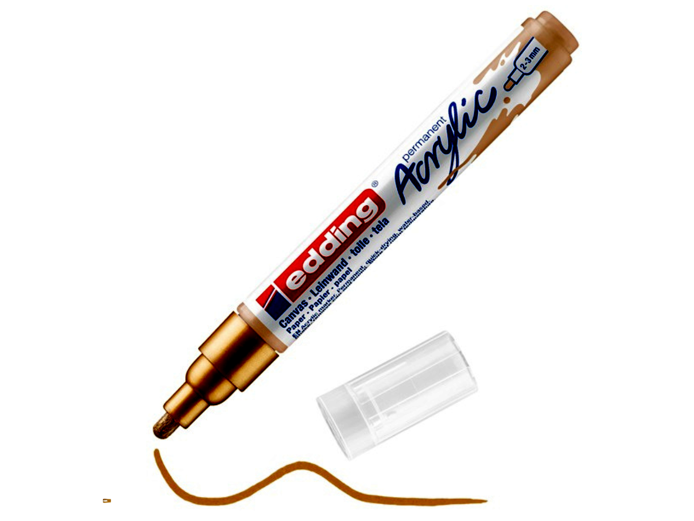 Az akril markerek nagy előnye, hogy a vízbázisú festék gyorsan szárad, és száradás után tartós, nem fakul. Az Edding 5100 M kerekített csúcsa lehetővé teszi a precíz, 2-3 mm vastagságú vonalak húzását. Ez az arany marker különösen jól mutat sötét felületeken, ahol a félig áttetsző arany szín egyedi hatást kelt.