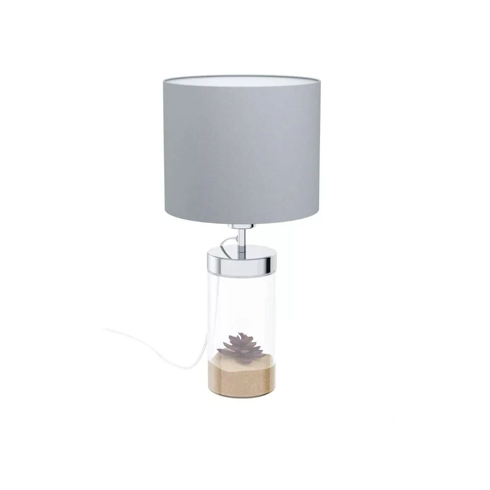 Ez a letisztult, mégis látványos asztali lámpa tökéletes választás nappaliba vagy hálószobába, ahol a hangulatvilágítás éppolyan fontos, mint az esztétikus megjelenés. A krómozott fém, az üveg és a szürke textilbúra kombinációja elegáns, modern enteriőrökben és klasszikusabb terekben is harmonikusan érvényesül.
