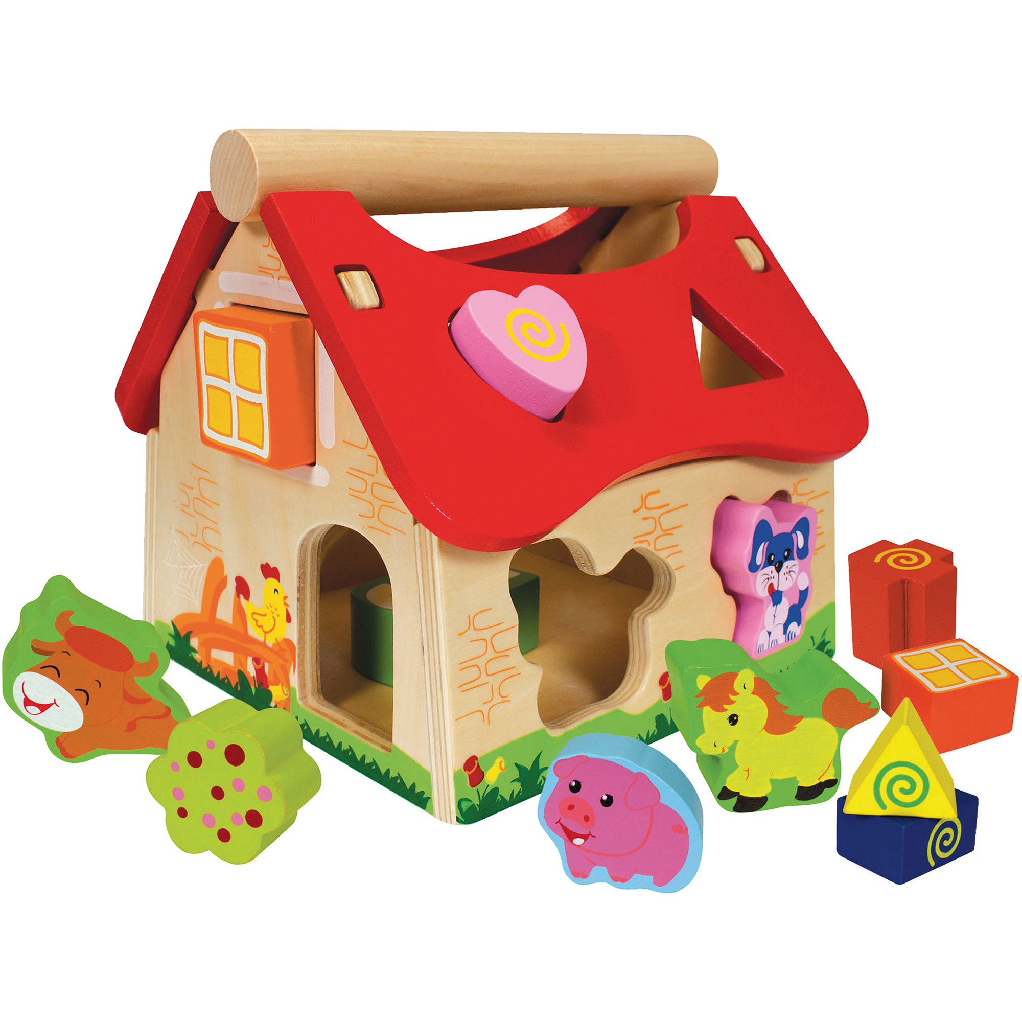 A ház oldalain különböző alakú nyílások találhatók, amelyekbe csak a megfelelő formájú építőkockák illenek. A gyermek feladata, hogy a megfelelő formát a megfelelő nyílásba illessze – ez egyszerre izgalmas kihívás és remek gyakorlás a finommotorika számára. A levehető tetőnek köszönhetően a bedobott faelemek könnyedén kivehetők, így újra és újra kezdődhet a játék.