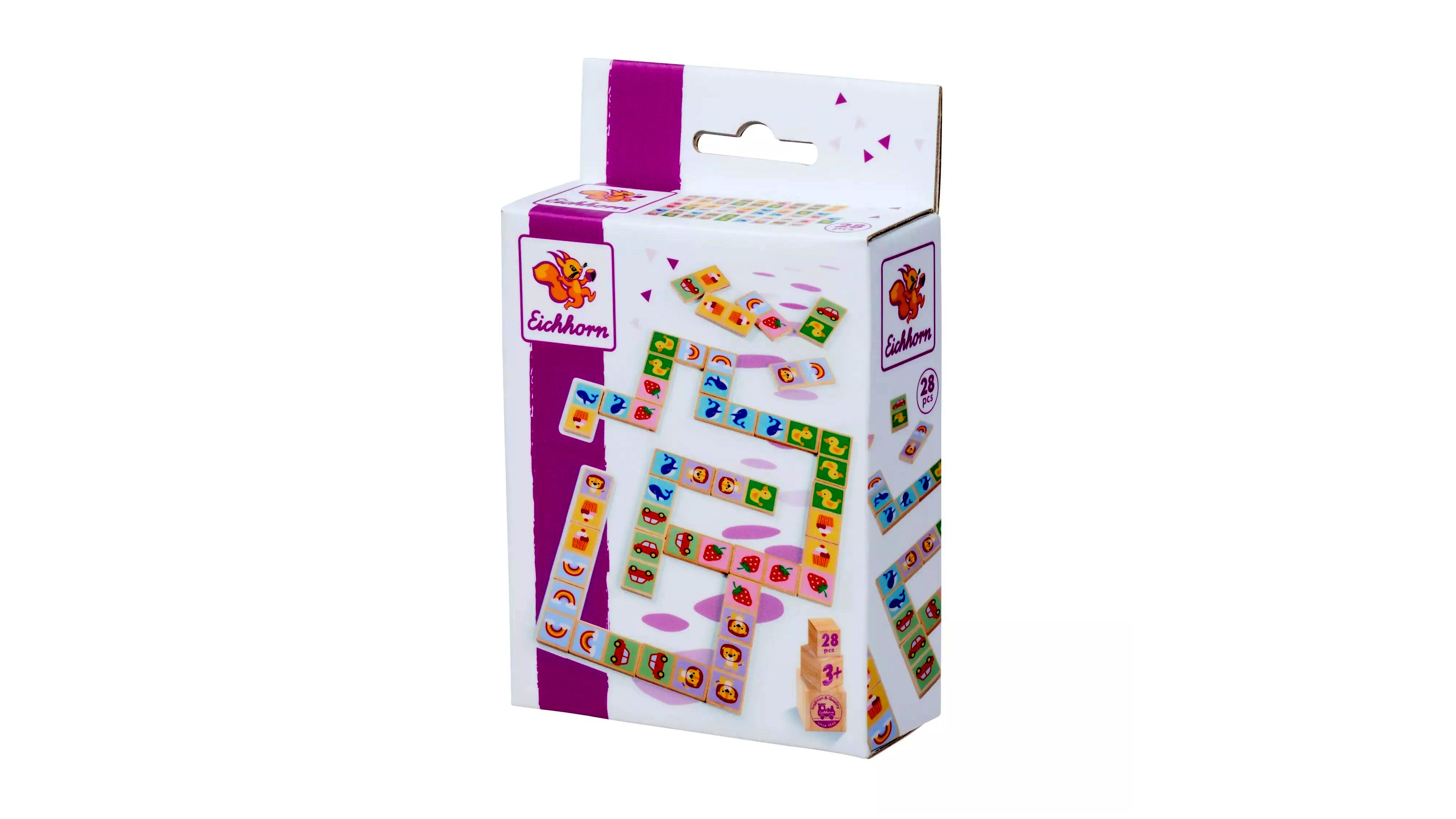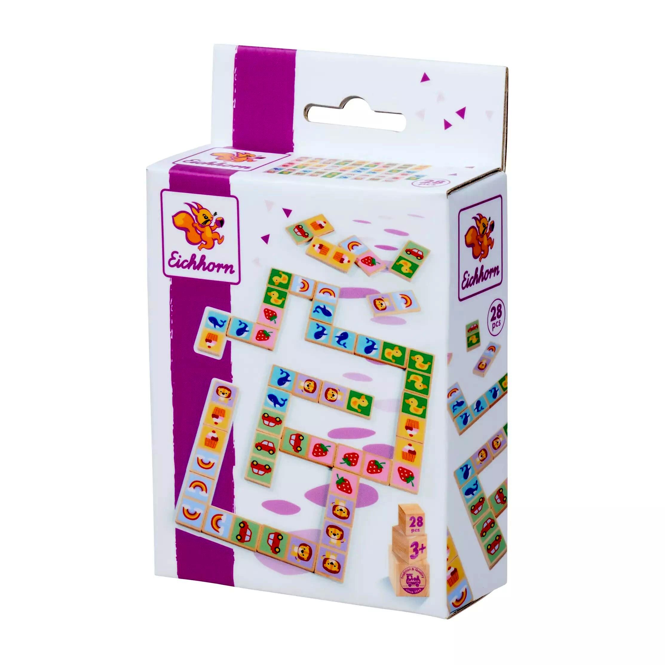 Fedezd fel a klasszikus dominózás örömét az Eichhorn fából készült dominó készletével! Ez a 28 darabból álló szett biztosan leköti gyermekeid figyelmét, miközben fejleszti logikai és megfigyelési képességeiket. Minden dominón különböző állatok és tárgyak ábrázolásai találhatók, amelyek további szórakozással és tanulással szolgálnak a kicsik számára.