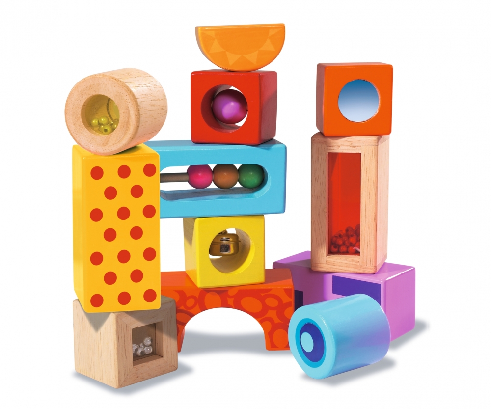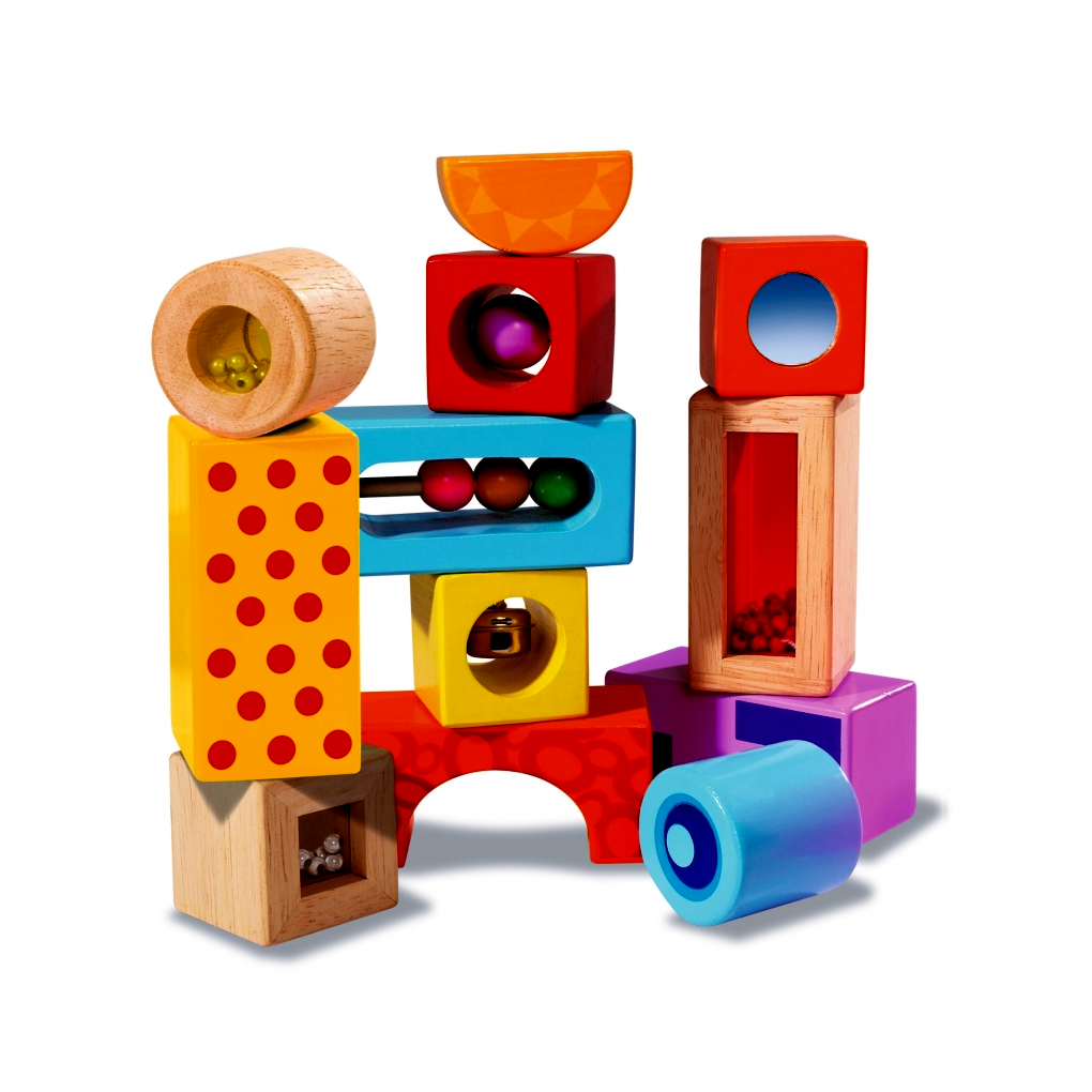 Eichhorn szín&hang építőjáték: Az Eichhorn 12, hanggal rendelkező építőeleme különböző formájú és színű. A blokkok nyírfából és márványból készültek, harangból és más apró tárgyakból állnak. A blokkok stimulálják és képzik a gyermek hallását, motoros képességeit és a kéz-szem koordinációt. 1 éves és idősebb gyermekek számára alkalmas.