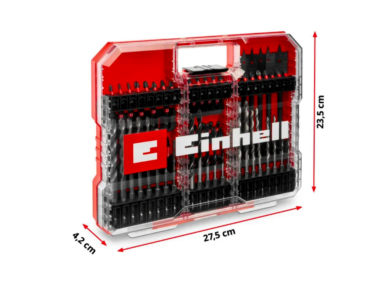 A műanyag, összecsukható doboz átlátszó fedéllel és automata reteszelő zárral készült, így a tartalom egy pillantással áttekinthető, mégis biztonságosan zárva marad szállítás és tárolás közben. A belső elrendezés minden elemet fix helyen tart, így a bitek és fúrók nem keverednek össze. A kompakt méret (kb. 275 × 235 × 42 mm) lehetővé teszi a könnyű elhelyezést szerszámosládában, polcon vagy járműben.