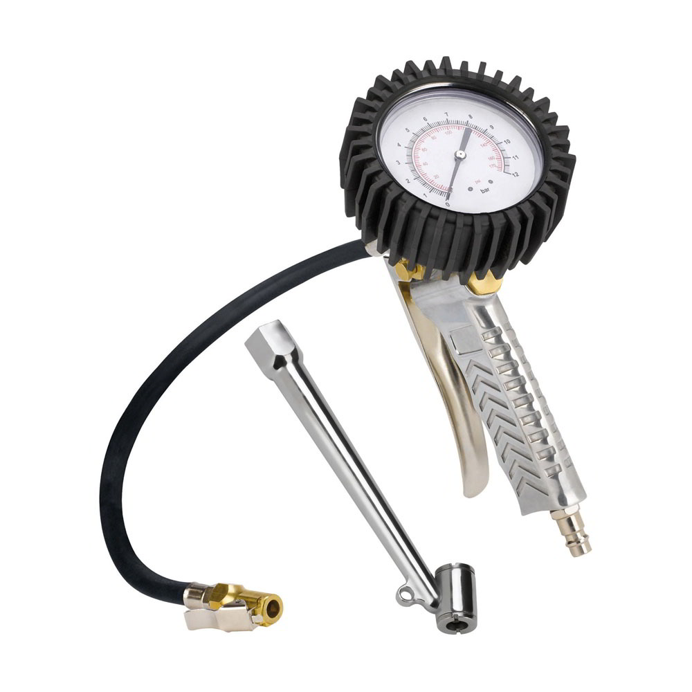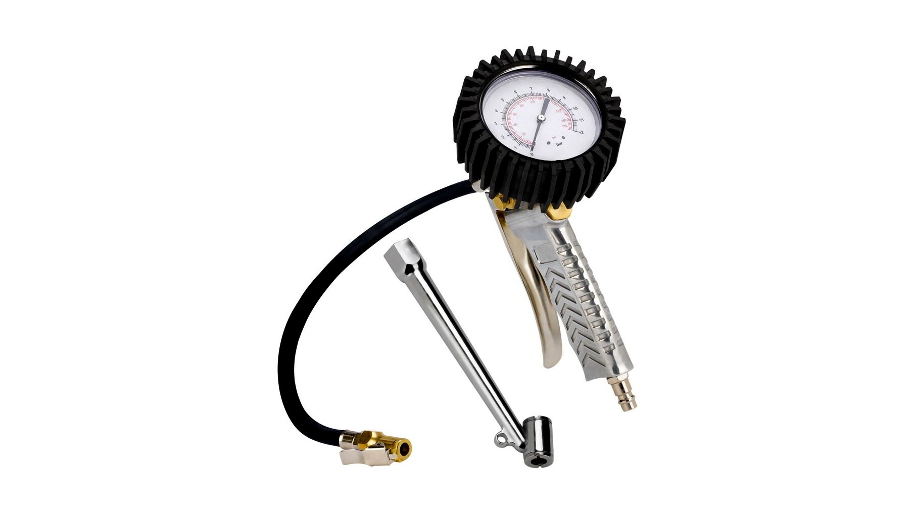 A Profi gumiabroncs nyomásmérő nélkülözhetetlen segítség az abroncsok nyomásának ellenőrzéséhez és felfújásához. A robusztus tartozékon található manométerről mindig leolvashatja az aktuális nyomást. A leeresztőszelep segítségével pontosan lecsökkentheti a nyomást a kívánt szintre. A szériatartozékként mellékelt, ikercsatlakozóval ellátott abroncsoltöltő adapter megkönnyíti az autók gumiabroncsainak felfújását.