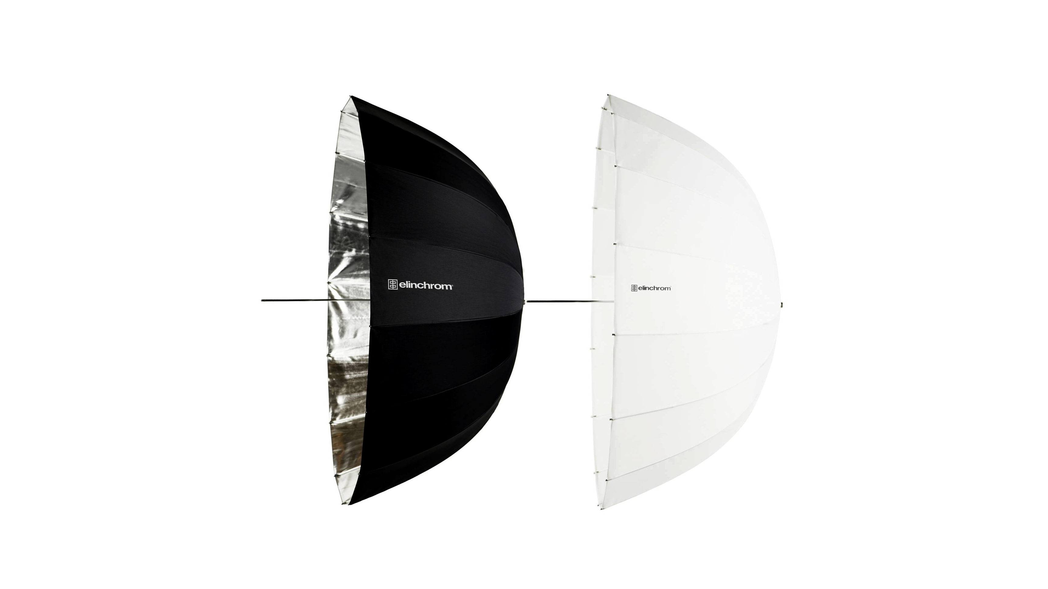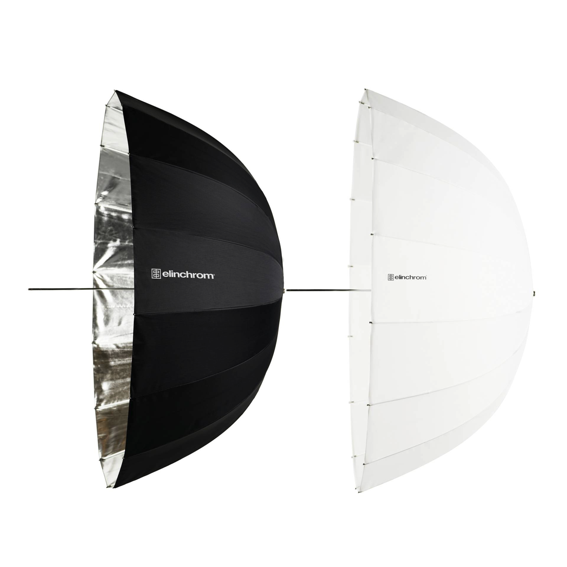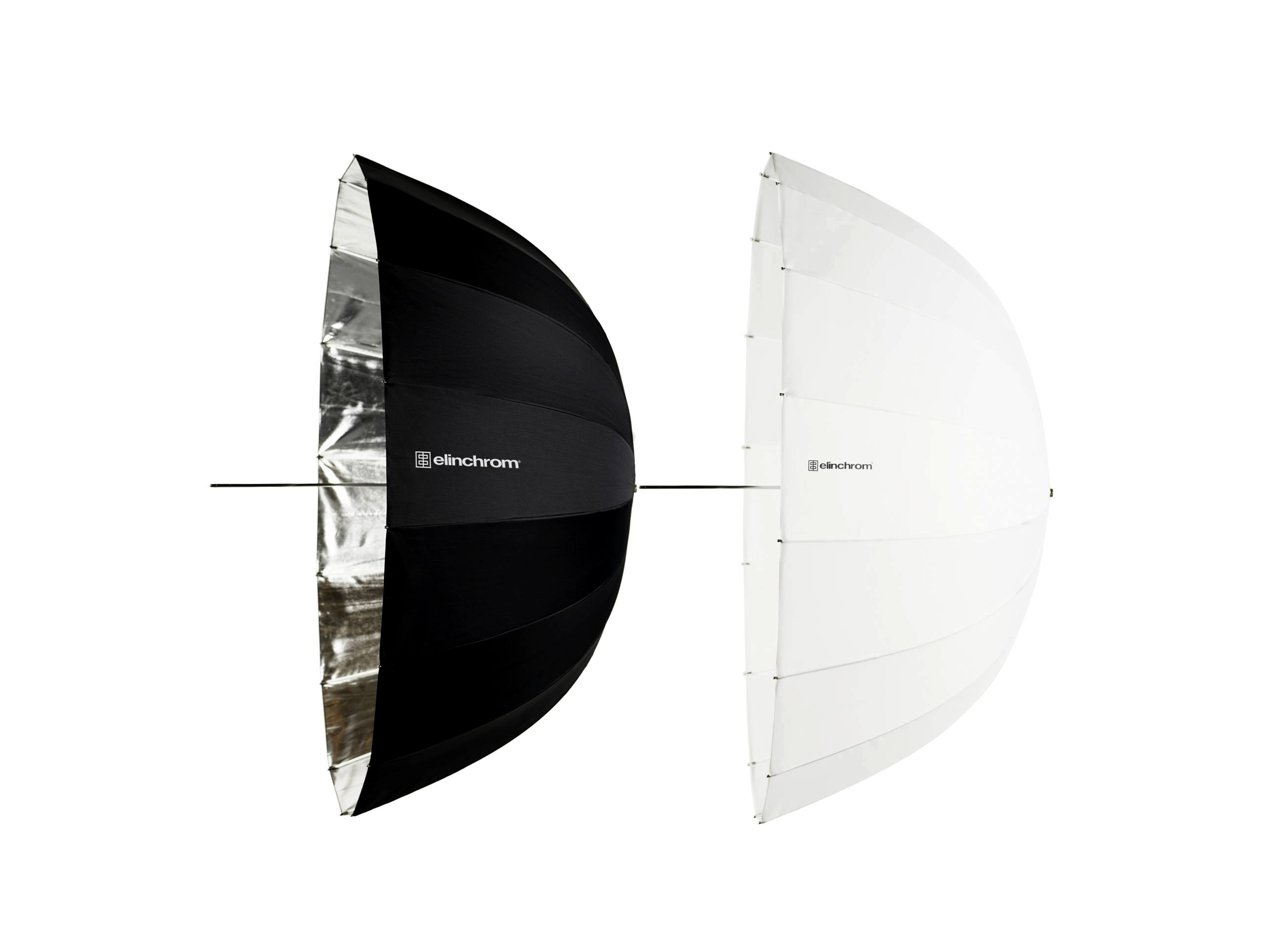 Két 105 cm-es mély esernyő ezüst és áttetsző színben. Ezüst a kontrasztosabb és intenzívebb megvilágításért.