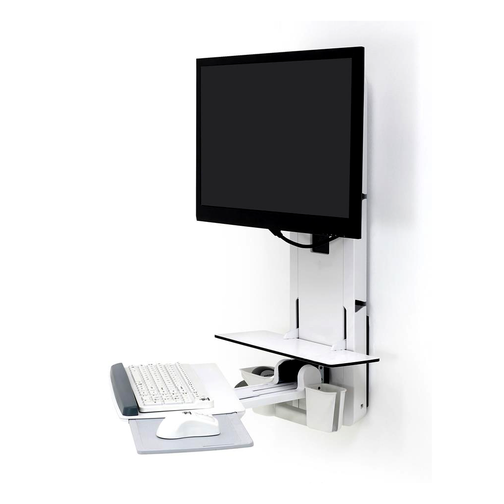 Nagyon alacsony profilú munkaállomás, amely az ülő és álló munkamagasság között állítható: mindössze 15 cm-es tárolási mélységével tökéletes megoldás szűkös betegszobákhoz.