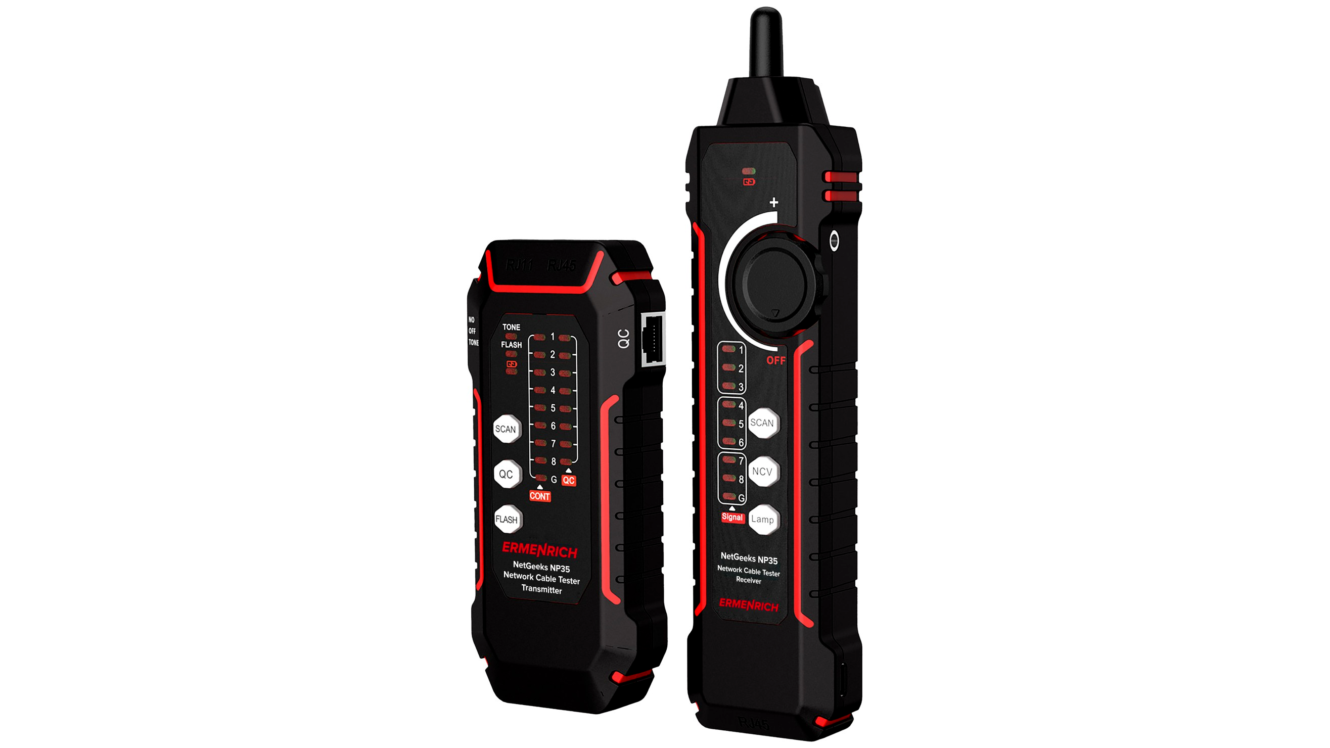 Az Ermenrich NetGeeks NP35 tesztelő egy jeladóból és egy vevőegységből áll – mindkettő áramellátásáról tölthető akkumulátorok gondoskodnak. A vevőegység állítható érzékenységű, és képes biztonságosan meghatározni a feszültségforrás helyét (aljzatok, kábelek, gépek). A vevőegység zseblámpájával sötét helyeken is kényelmesen lehet dolgozni, a fülhallgatókat pedig a vevőegységhez lehet csatlakoztatni a túlzottan hangos külső zajok kizárása érdekében.