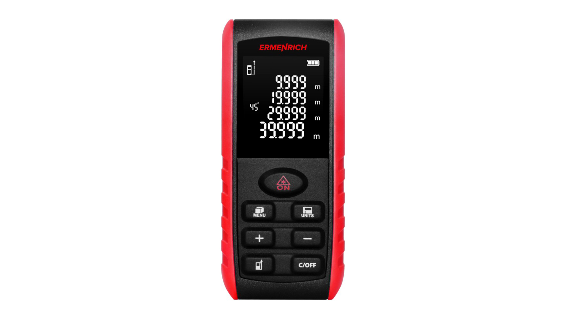 Az Ermenrich Reel GE100 lézeres mérő egy kompakt műszer, különböző építőipari, javítási és mindennapi feladatokban való használatra. Segítségével 2 milliméteres pontossággal meg lehet határozni két pont közötti távolságot, továbbá kiszámítható vele a terület és a térfogat, illetve meg lehet mérni egyes objektumok szögét. A mérőműszer emellett Pitagorasz-tétel funkcióval is rendelkezik – a távolságokat köztes mérések segítségével is ki tudja számítani. Ez akkor lehet praktikus, ha a mérőműszert nem lehet a kívánt ponton elhelyezni, vagy ha a sugár útjában akadály van.