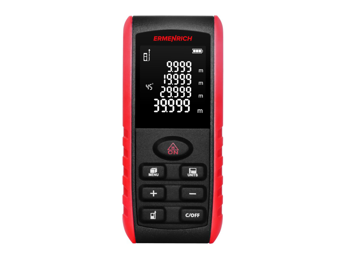 Az Ermenrich Reel GE40 lézeres mérő praktikus, multifunkciós eszköze építési, javítási, és mérnöki munkákhoz. Segítségével max. 40 méterig mérhet távolságokat, továbbá területet, térfogatot és szögeket számíthat. Ha nehéz körülmények között kell méréseket végeznie, a Pitagorasz-tétel funkció köztes mérésekből segít kiszámítani a távolságot.