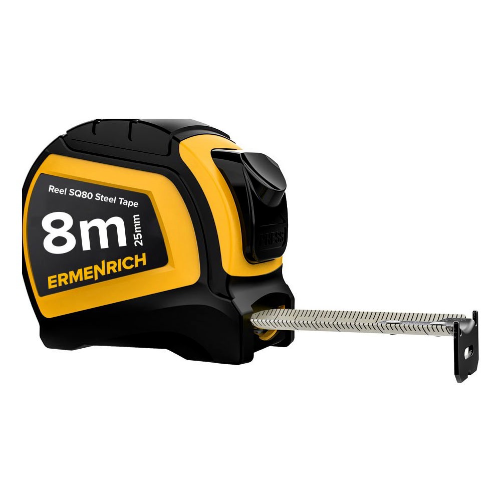 Az Ermenrich Reel SQ80 klasszikus mérőszalag a mindennapi feladatok hasznos eszköze, valamint hatalmas segítség a javítások során. Az építési szakemberek eszköztárához is hozzáadható. Használható építési és befejezőanyagok, munkadarabok és szerelvények méreteinek, valamint távolságok mérésére akár 8 méteres tartományban. A szalag önzáró és ergonomikus kialakítású zárógombbal rendelkezik. Az Ermenrich Reel SQ80 csiszolt acélból készült, a tok anyaga pedig nagy szilárdságú ABS műanyag, valamint gumírozott. Ennek köszönhetően a mérőszalag biztosan illeszkedik a kézbe és ellenáll a külső hatásoknak. A szalag szabad végére rögzített erős horog biztosítja a megfelelő helyzetet a mérések alatt és használható a puha anyagok megjelölésére is. Az övcsíptető és a kézi pánt különböző lehetőségeket kínál az eszköz rögzítésére és hordozására.