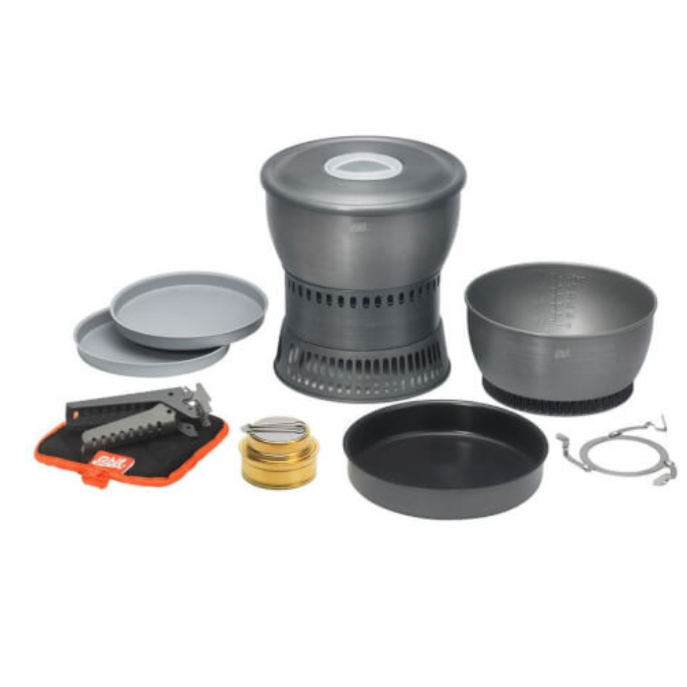 A készlet mindent tartalmaz, amire egy többnapos túrán a főzéshez szüksége lehet: két különböző méretű fazék, serpenyő, alkoholos égőfej, fedő, tányérok és praktikus kiegészítők – mindez kompakt módon egymásba pakolható.