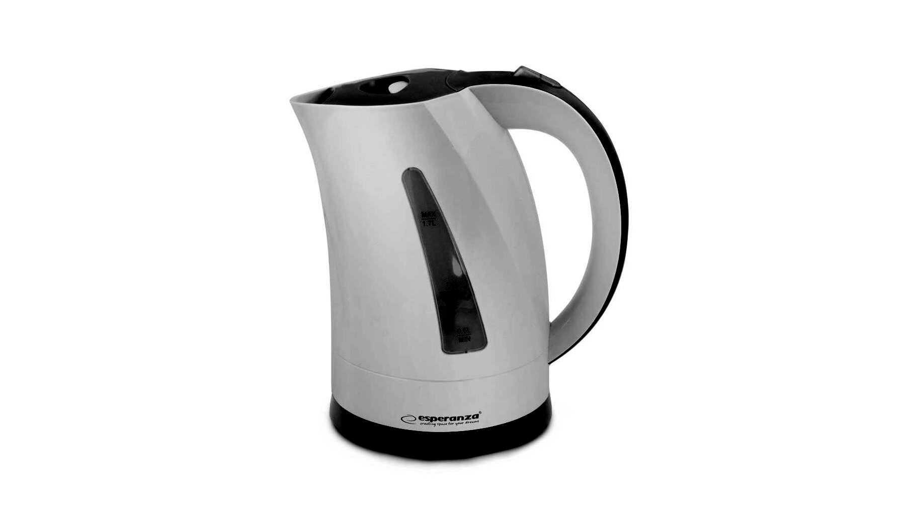 Ergonomikus kialakítású elektromos vízforraló hőálló műanyag készülékházzal. Rozsdamentes acélból készült spirális fűtőelem.