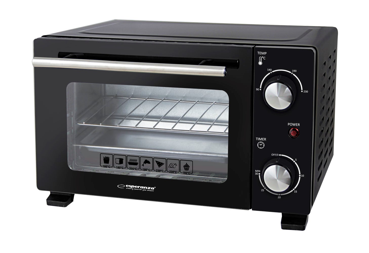 A belső térben kényelmesen elférnek kisebb tepsik, pizzák, pékáruk vagy egy-két adag főétel is.