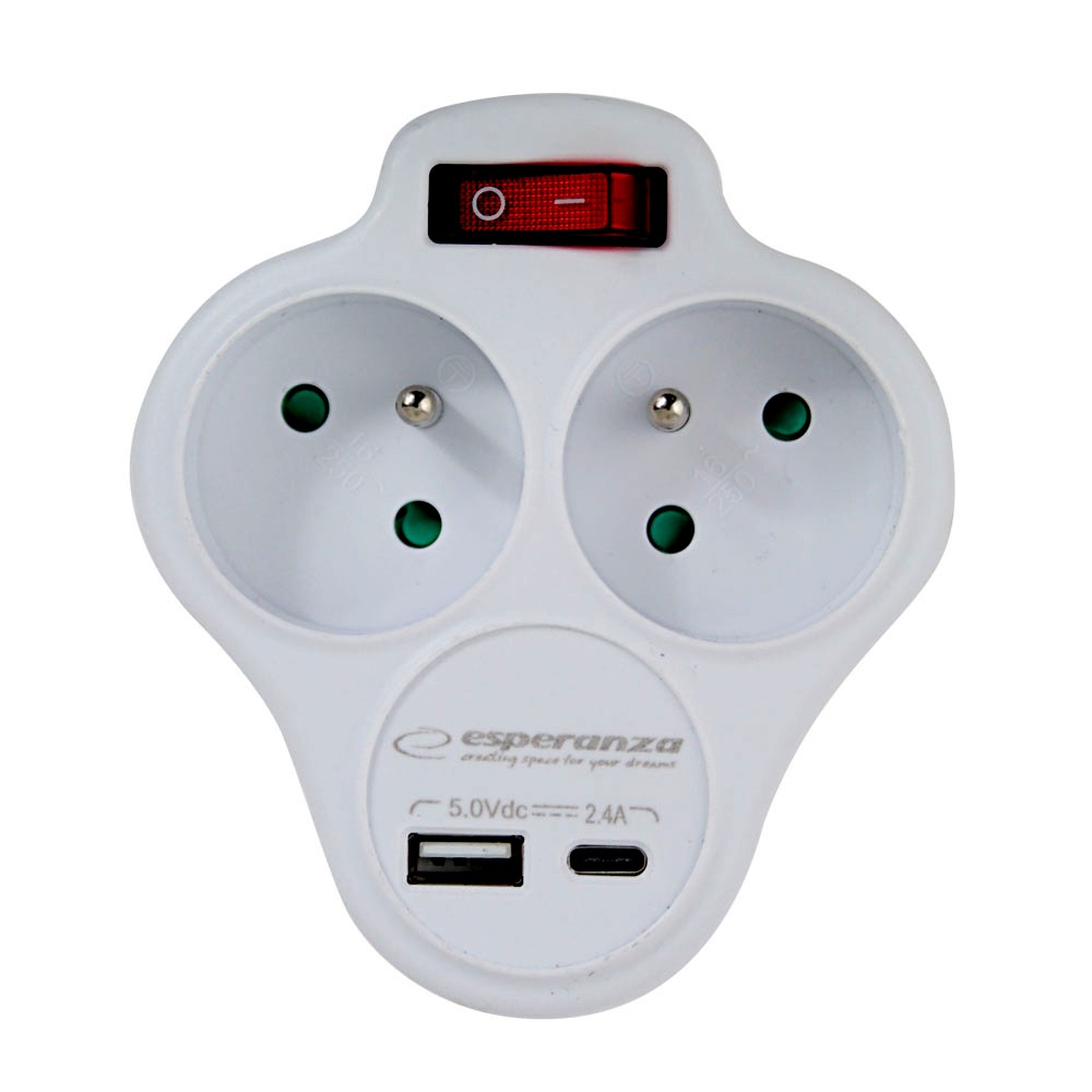 Az Esperanza elektromos elosztó 2 földelt aljzattal és USB-C/USB-A töltővel rendelkezik, melyet beépített kapcsolóval láttak el. Ez a praktikus eszköz lehetővé teszi, hogy egyszerre két elektromos berendezést csatlakoztasson és egyidejűleg mobil eszközeit is töltse. Solid konstrukciójának és beépített védelmeinek köszönhetően biztonságos és stabil áramellátást biztosít mind otthon, mind pedig az irodában.