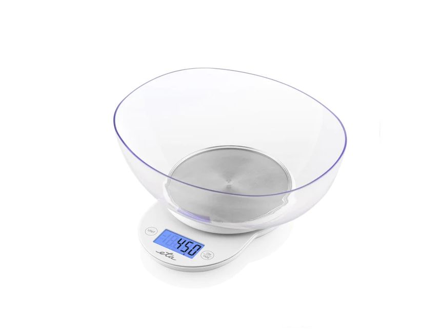 Az ETA Mari konyhai mérleghez tartozik még egy 2,6 l térfogatú kivehető műanyag tál. A TARE funkció levonja az edény aktuális tömegét, így fokozatosan adagolhat más hozzávalókat is. A mért értékek nagyméretű és tiszta LCD kijelzőn jelennek meg. Inaktivitás esetén a konyhai mérleg 30 másodperc után automatikusan kikapcsol, így kíméli az akkumulátort.