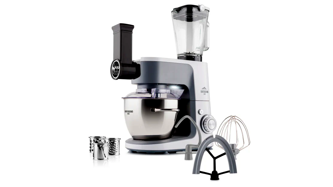 A multifunkciós konyhai robotgép fém fogaskerekekkel és erős, 1200 W teljesítményű motorral rendelkezik. Az ETA Gratussino Bravo III segít a habverésben, keverésben, dagasztásban, zöldségek reszelésében, valamint smoothie-k, levesek és fagylalt elkészítésében. Stabilitásáról a csúszásgátló lábak és a stabilizátor gondoskodik, amely még nagy terhelés esetén is fenntartja a beállított fordulatszámot.