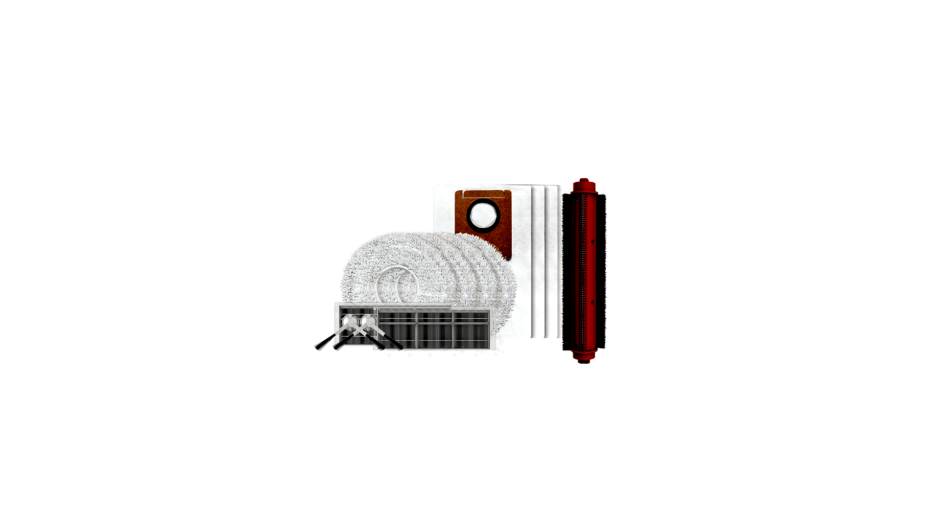 • Készlet tartalma: 1× fő kefe, 2× oldalsó kefe, 2× nagy hatékonyságú szűrő, 4× felmosó szövet, 4× porzsák (4 L)