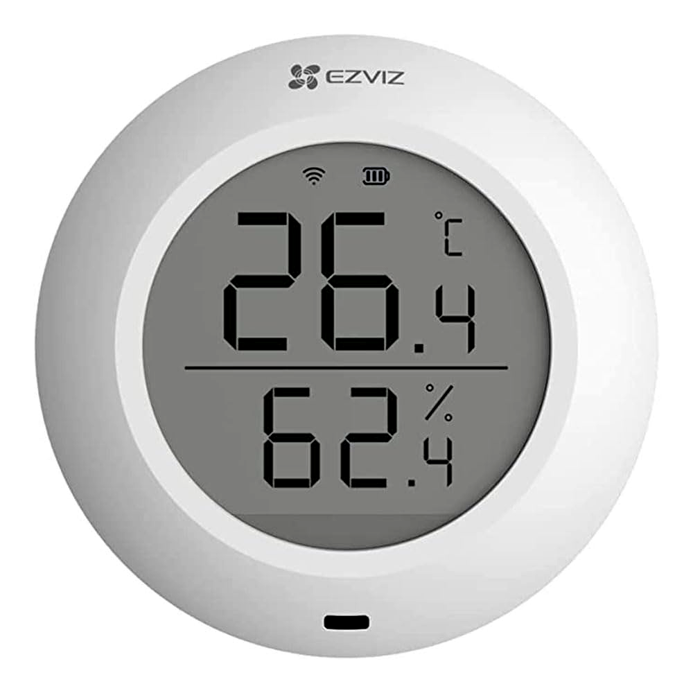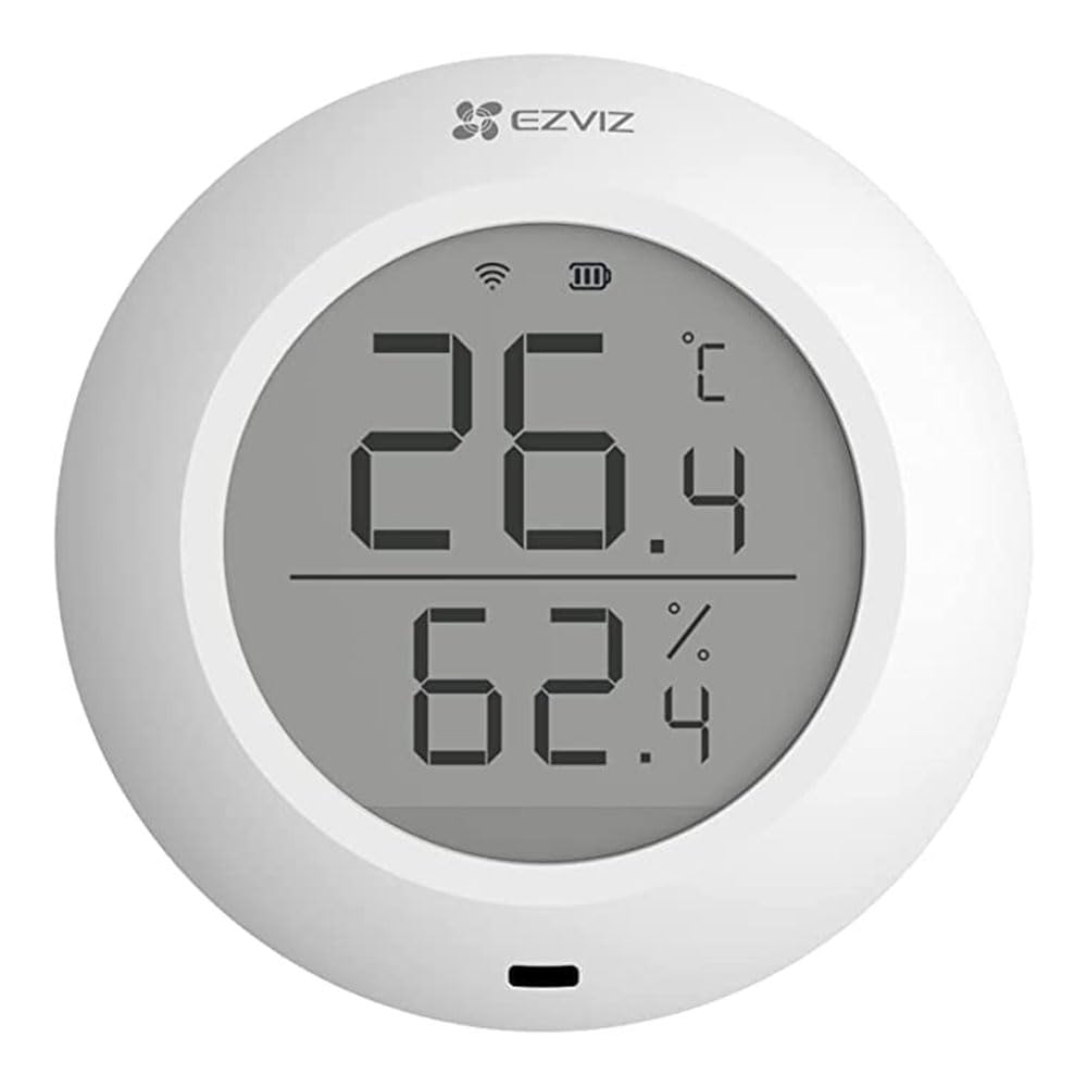 A T51C nagy pontosságú érzékelőchippel rendelkező apró kütyüként érzékeli és megjeleníti a helyiség hőmérsékletét és páratartalmát a nagy képernyőn. Miután csatlakoztatta az EZVIZ Home Gateway-hez, valós idejű adatokat is ellenőrizhet, vagy áttekintheti a korábbi trendeket az EZVIZ alkalmazásban, mielőtt hazaérkezik.