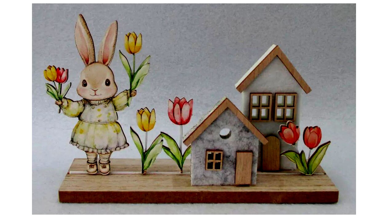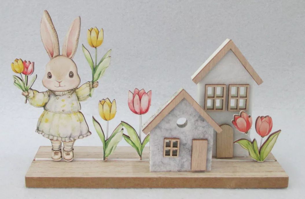 A dekoráció két apró, stilizált fa házikóból áll, amelyek elé egy kedves nyuszi figura és élénk színű tulipánok kerültek. A fa finoman megmunkált, a festés visszafogott, mégis vidám árnyalatokkal történik, így a dísz nem harsány, hanem harmonikusan illeszkedik a meglévő lakberendezéshez.