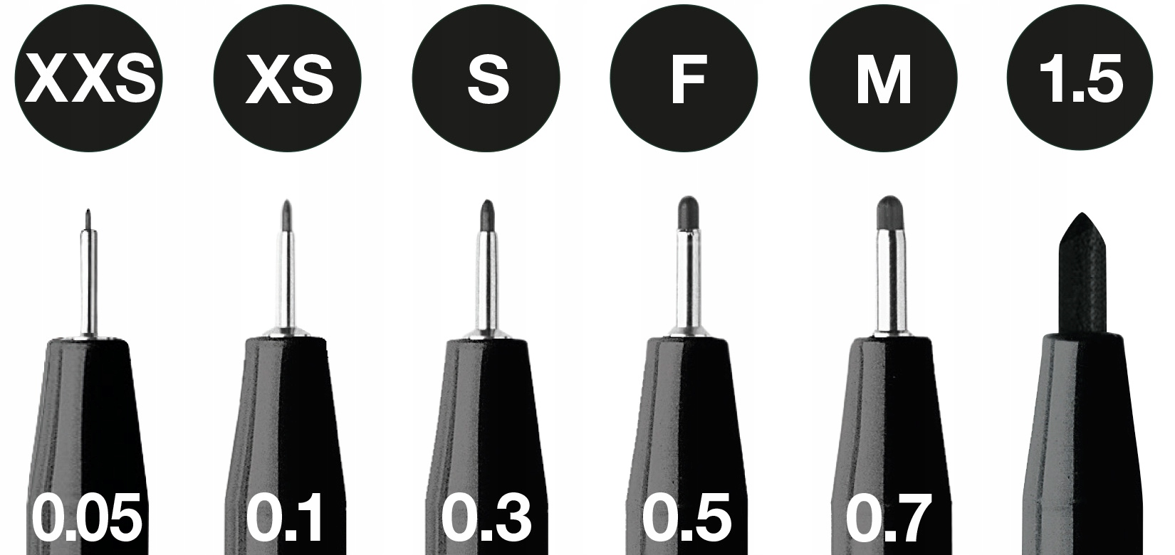 M – 0,7 mm • F – 0,5 mm • S – 0,3 mm • XS – 0,1 mm • XXS – 0,05 mm • 1,5 mm