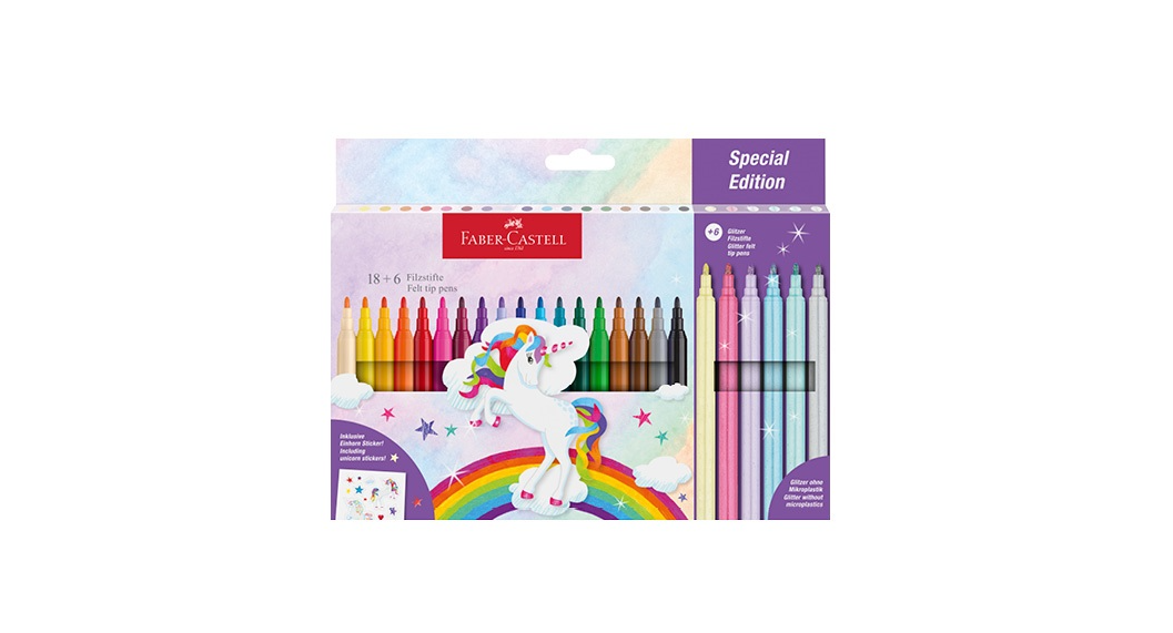 • Teljes készlet tartalma: 18 klasszikus színű filctoll + 6 csillámló, pasztell filctoll + unikornis matrica