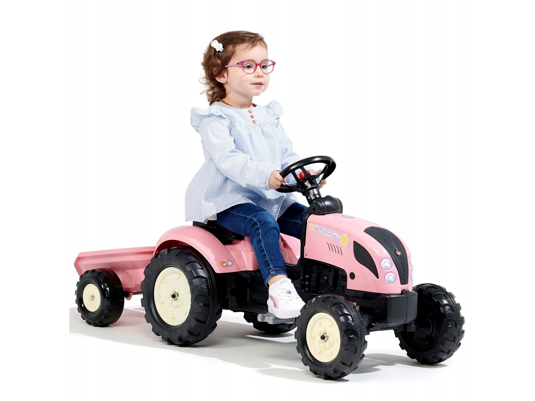 Vagány traktor vagány, kalandor kislányoknak - méghozzá opcionálisan lecsatolható pótkocsival! És hogy még élvezetesebb legyen a játék, a traktort pedálok segítségével lehet hajtani. Rózsaszín színe cuki külsőt kölcsönöz ennek a masszív járgánynak.