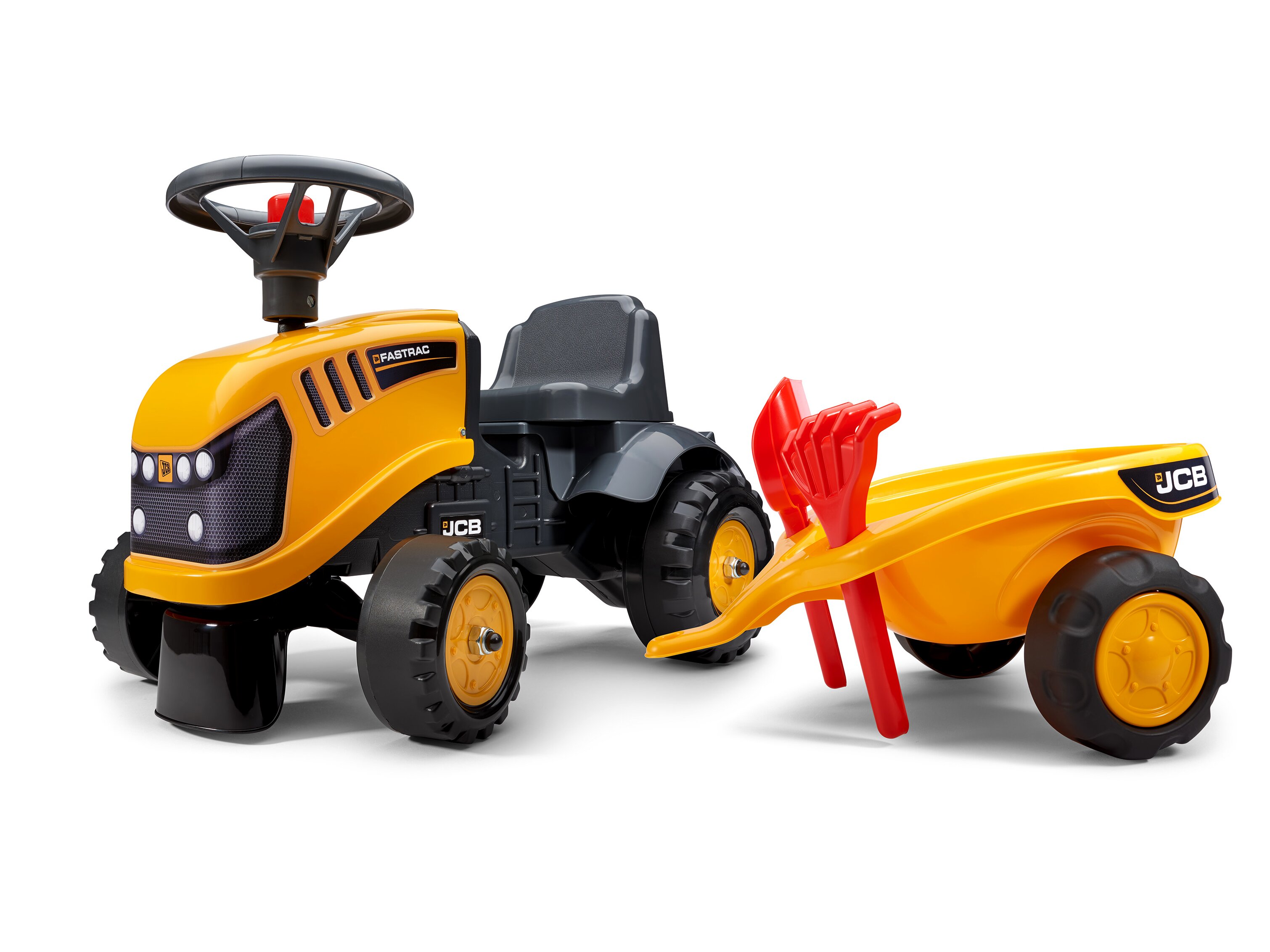 A lábbal hajtós, népszerű JCB traktor biztosan lenyűgözi majd a munkagépek szerelemeseit. A járgány lecsatolható utánfutóval, gereblyével és lapáttal rendelkezik. A valódi terepmintás kerekek jól boldogulnak a különböző terepeken, megjelenése pedig valósághű megjelenést kölcsönöz neki. A traktor erős, strapabíró műanyagból készült, dudával, és funkcionális kürttel van felszerelve.