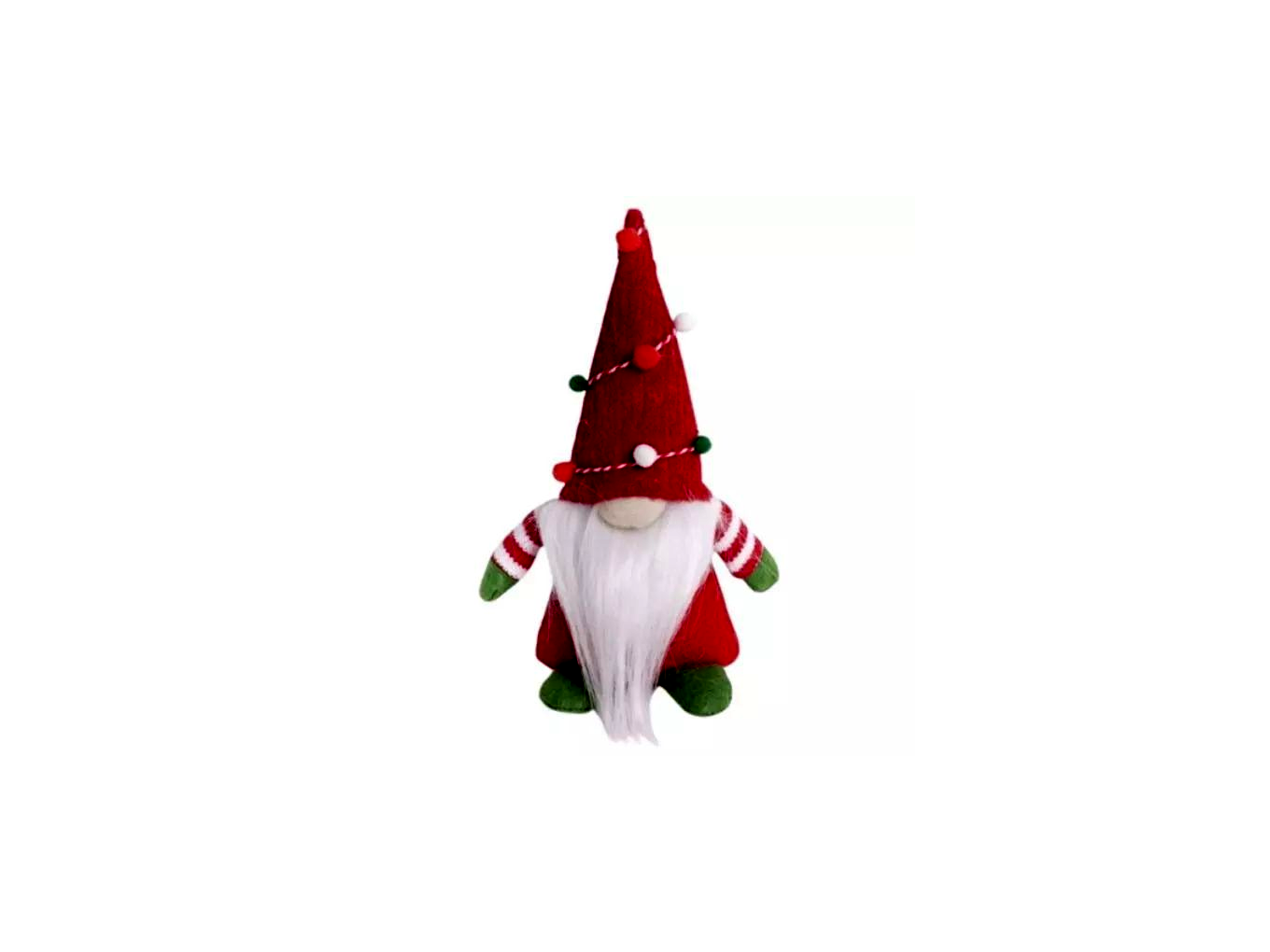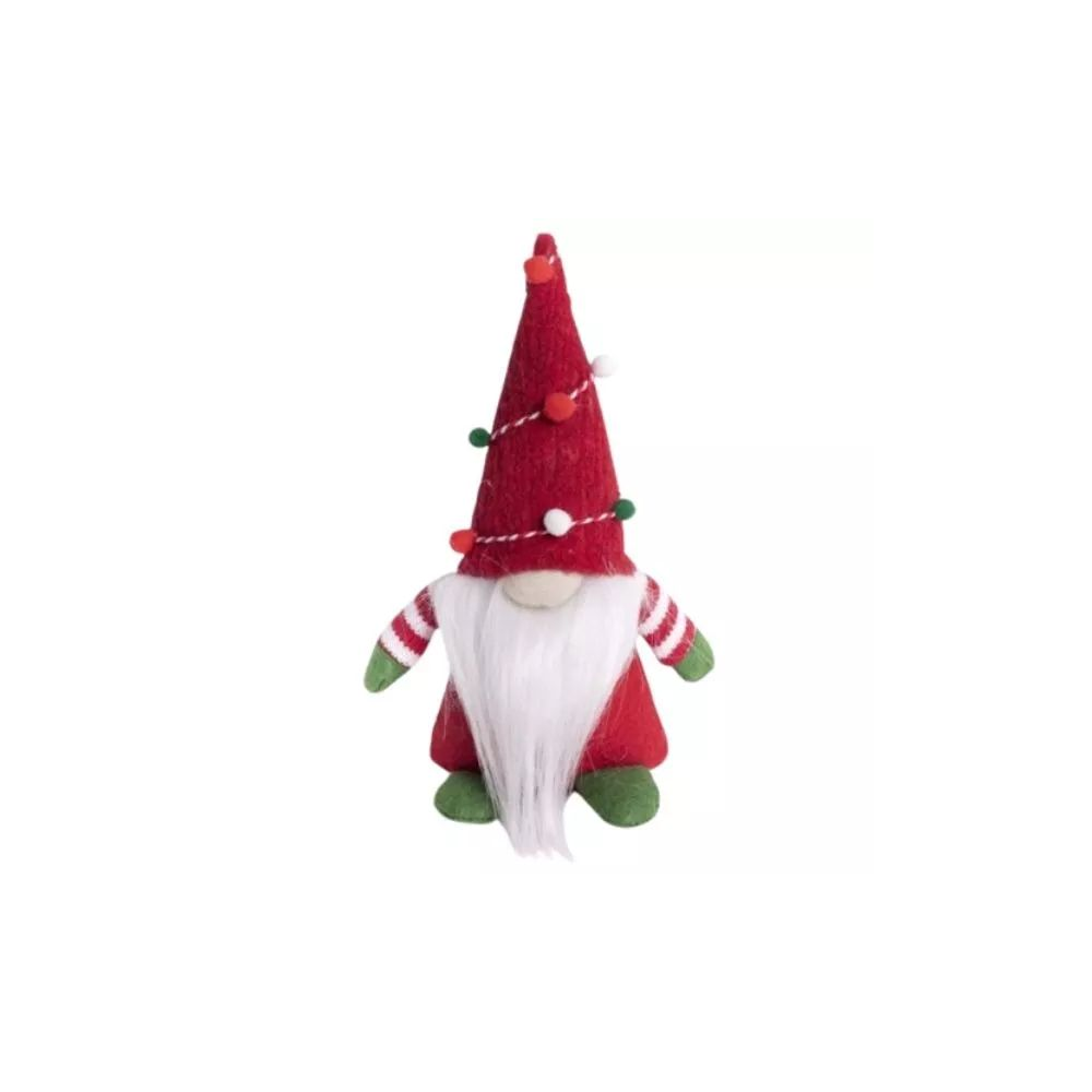 A manó sapkáját élénk piros, fehér és zöld golyócskák díszítik, ami még vidámabbá és ünnepibbé teszi. Piros-fehér csíkos felsője tökéletesen illik az évszak színeihez, így bármely karácsonyi dekoráció remek kiegészítője lehet.
