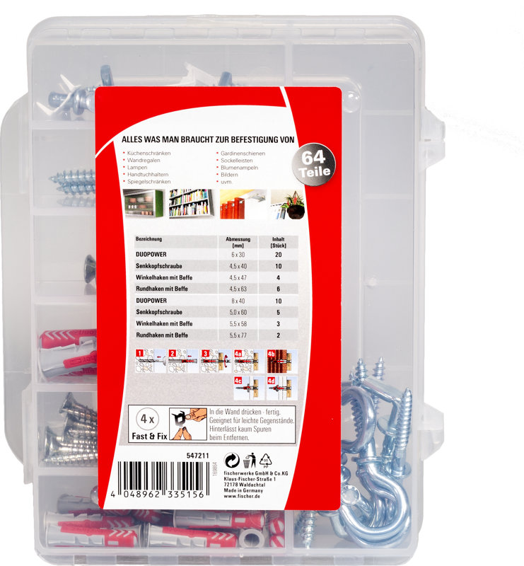 A fischer DUOPOWER 6.8 mozgatható doboz a legfontosabb rögzítéseket tartalmazza, amelyekre új lakásba költözéskor van szüksége, átlátszó dobozban rendezve. A készlet tartalmazza a DUOPOWER 6 x 30 és a DUOPOWER 8 x 40 tipliket, valamint megfelelő csavarokat, csavarhorgokat, szemcsavarokat és fali kampókat. A fischer DUOPOWER univerzális tipli nagyon jó tartási értékeket kínál 2 alkatrésznek köszönhetően: A kiváló minőségű nejlonból készült szürke komponens automatikusan aktiválja az optimális működési elvet (tágulás, hajtás, csomózás) a legjobb tartás érdekében, az építőanyagtól függően. A piros alkatrész tágulási szárnyai támogatják a biztonságos tágulást és további biztonságot nyújtanak a szürke alkatrész számára. A kifejezett elfordulásgátlók reteszelődnek az építőanyagban, és megakadályozzák a fúrólyuk forgását. A sima futású nyílás biztosítja a csavar könnyű rögzítését, valamint a csavarcsatornában való biztonságos vezetését és rögzítését. A fischer DUOPOWER megakadályozza a csavar túlzott meghúzását, és a lehető legjobb visszajelzést biztosítja (jól érzi magát) a horgonytól. Érezhető, hogy a tipli tökéletesen ül. A tipli fején kialakított perem megakadályozza a tipli becsúszását a furatba.