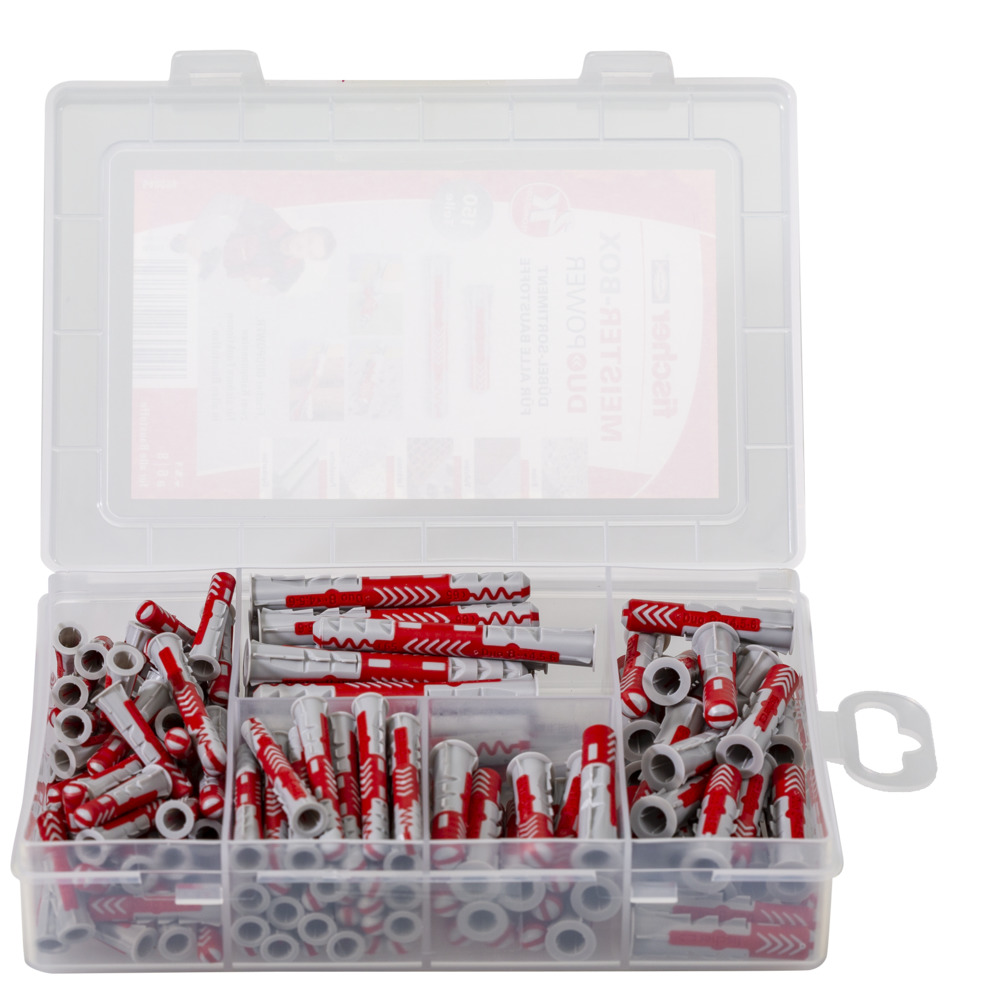 A fischer master box DUOPOWER rövid / hosszú tartalmaz előválogatott 100 rövid és 50 hosszú DUOPOWER tiplit. A fischer DUOPOWER univerzális tipli nagyon jó tartási értékeket kínál 2 alkatrésznek köszönhetően: A kiváló minőségű nejlonból készült szürke komponens automatikusan aktiválja az optimális működési elvet (tágulás, hajtás, csomózás) a legjobb tartás érdekében, az építőanyagtól függően. A piros alkatrész tágulási szárnyai támogatják a biztonságos tágulást és további biztonságot nyújtanak a szürke alkatrész számára. A markáns elfordulásgátlók reteszelődnek az építőanyagban, és megakadályozzák a fúrólyuk forgását. A sima futású nyílás biztosítja a csavar könnyű rögzítését, valamint a csavarcsatornában történő vezetését és rögzítését. A fischer DUOPOWER megakadályozza a csavar túlzott meghúzását, és a lehető legjobb visszajelzést biztosítja (jól érzi magát) a horgonytól. Érezhető, hogy a tipli tökéletesen ül. A tipli fején kialakított perem megakadályozza a tipli becsúszását a fúrólyukba.