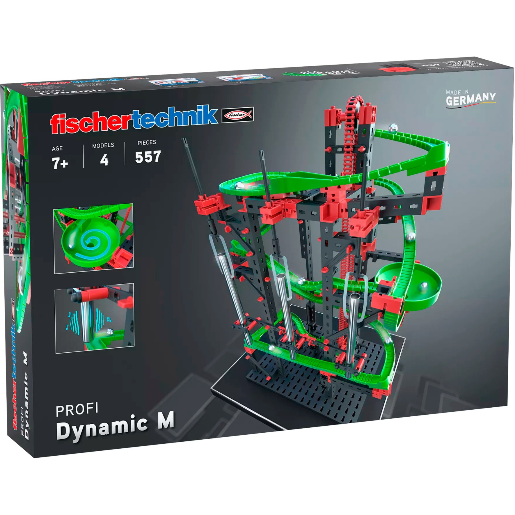 A Fischertechnik Dynamic M építőkészlet tartalma szerteágazó és változatos. A készlet tartalmaz egy forgótölcsért, három hangcsövet, egy váltót, öt 90°-os kanyart, mágneses tartókat, nyolc golyót, négy 90°-os flexibilis sínt, és tizennégy 180°-os flexibilis sínt. Ezek az elemek lehetővé teszik a kreatív építést és rengeteg kombinációs lehetőséget kínálnak.