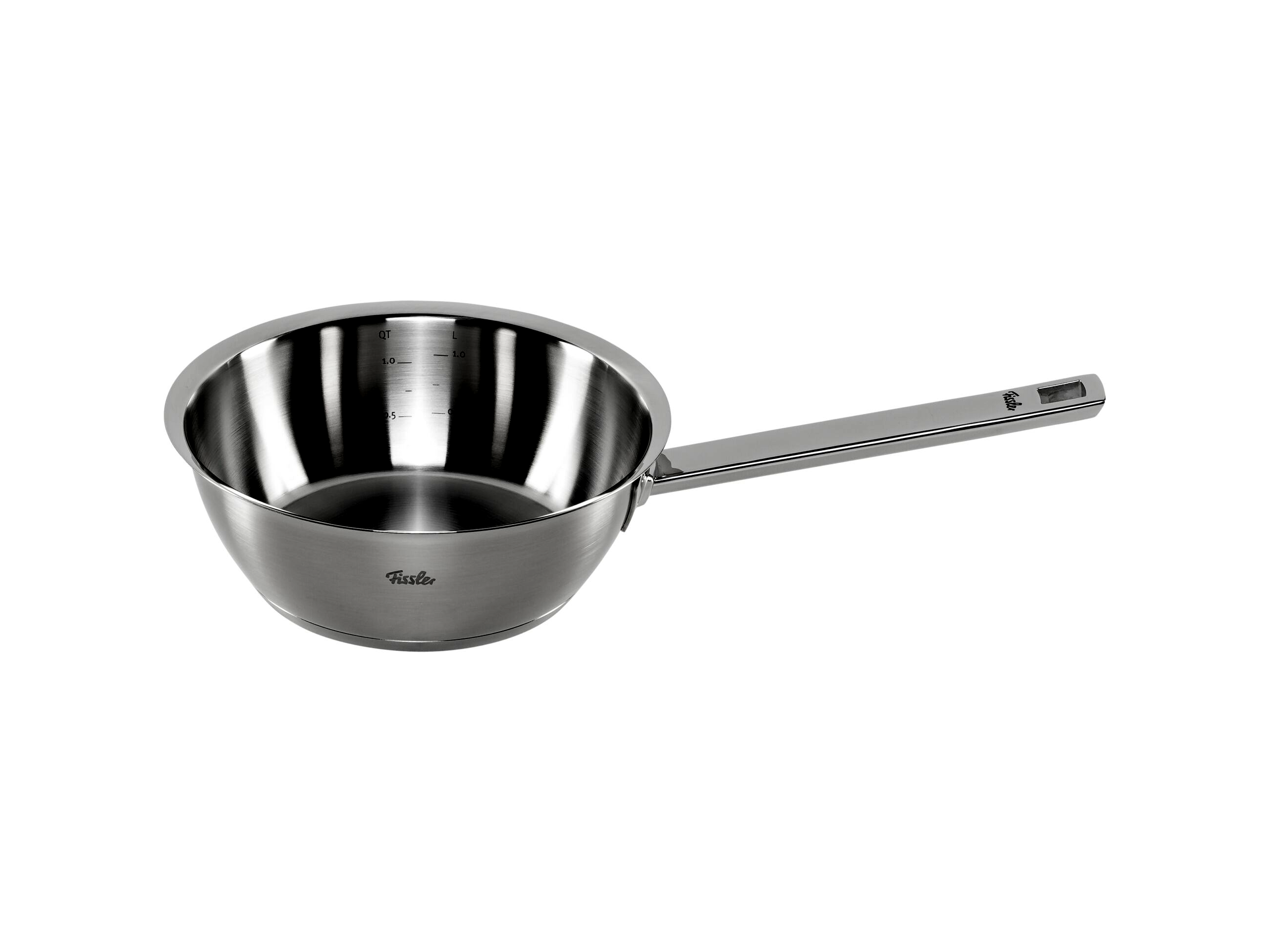 A serpenyő széles kiöntő peremmel és hideg fém fogantyúval a Fisslertől, ideális ropogós zöldségek és lédús húsdarabok pirításához.