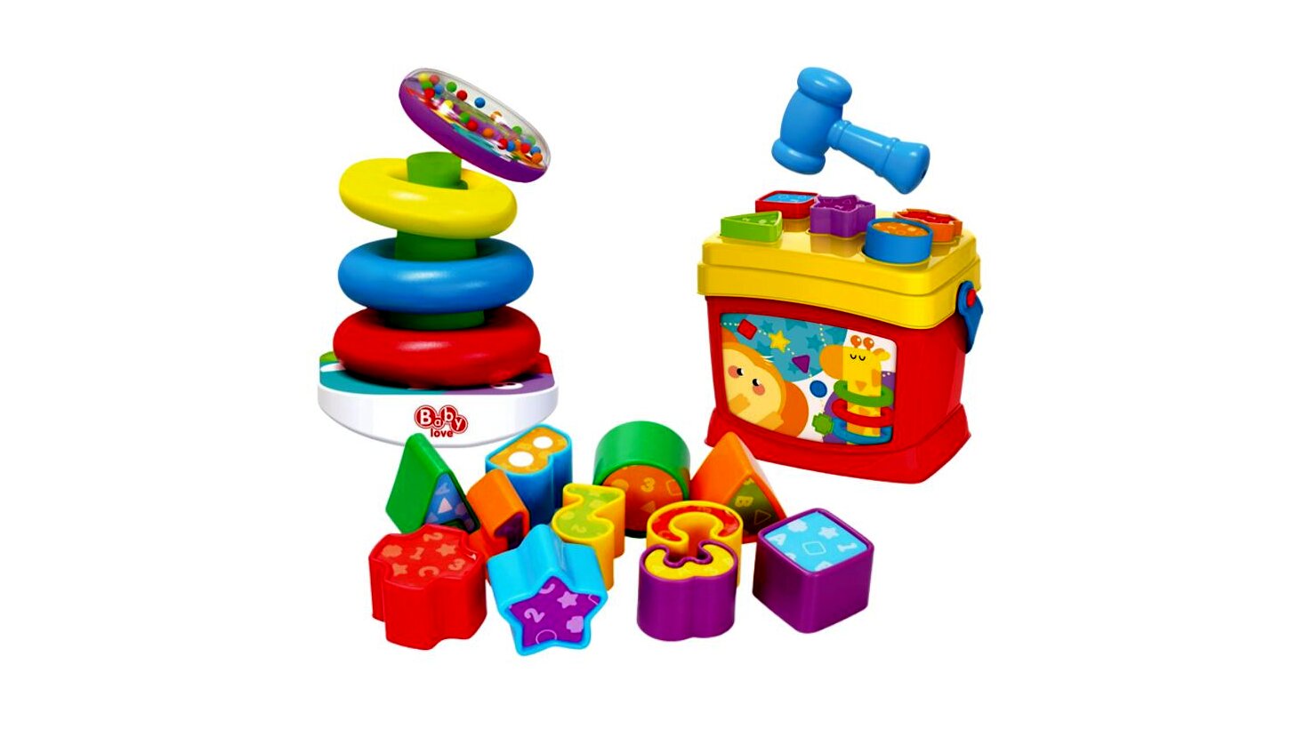 A csomag tartalmaz egy válogató játékot vödörrel, 10 különböző formával és egy halmozható játékot 4 gyűrűvel. A kicsik kedvenc része biztosan a kalapács lesz, amely segíti őket a koordinációs készségek fejlesztésében.