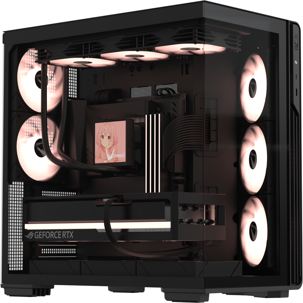 A gépház minimalista fekete megjelenést kapott, amelyet a teljes oldalas ablakos kialakítás tesz igazán látványossá. A belső ARGB ventilátorok fénye tökéletesen átvilágítja az oldallapot, így a gondosan megépített konfiguráció teljes pompájában megmutatható. A letisztult frontrész és a rejtett rögzítések prémium érzetet keltenek, miközben a masszív SPCC acélváz hosszú távú stabilitást biztosít.