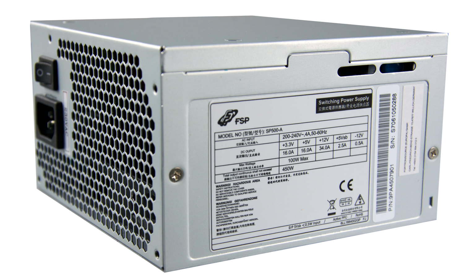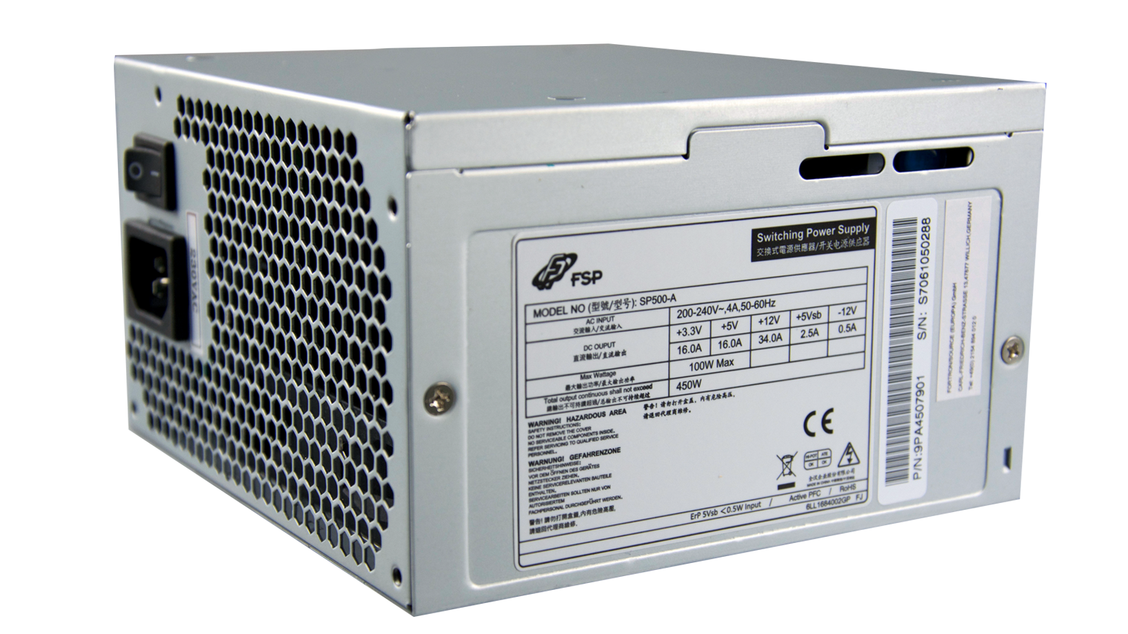 Ez az ATX / PS2 tápegység (PSU) 500 W csúcsteljesítménnyel rendelkezik, amely a legújabb középkategóriás CPU-kkal és nagy sebességű HDD-kkel felszerelt rendszereket látja el. Az SP-A teljes körű védelmet (OCP, OVP és SCP) is tartalmaz a számítógép számára.