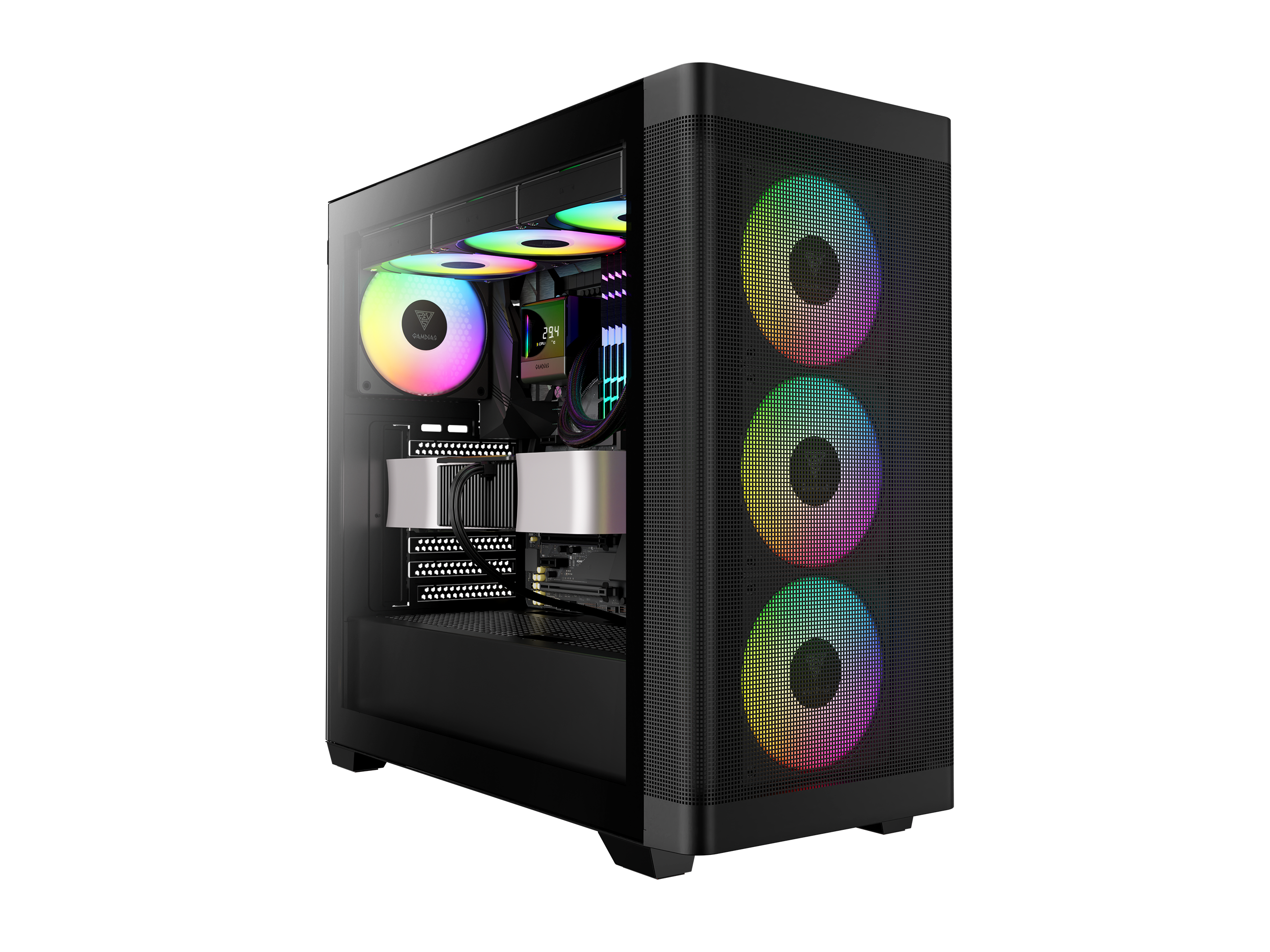 • A fekete, visszafogott külső és a belső RGB megvilágítás elegáns, mégis játékos kombinációt ad: világítás nélkül komoly, letisztult, bekapcsolva pedig igazi gamer gép benyomását kelti.