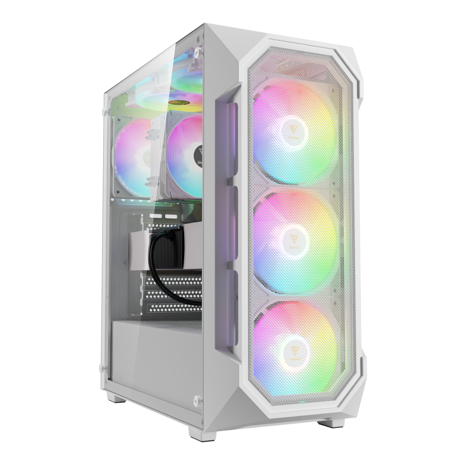 A Gamdias fehér, edzett üveg oldallappal és gyárilag szerelt ARGB ventilátorokkal szerelt midi toronyháza ideális választás mindazoknak, akik egy stílusos, jól szellőző és könnyen szerelhető számítógépházat keresnek. A tágas belső tér, az átgondolt kábelmenedzsment és a 4 darab 120 mm-es ventilátor már dobozból kivéve biztosítja a stabil hűtést, miközben az ARGB világítás gondoskodik a lenyűgöző látványról.