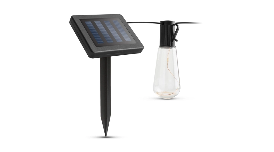 Egy hangulatos teraszra, kertre vágyik? Dobja fel otthonát energiahatékony, szolár fényfüzérrel! A hagyományos villanykörtére hasonlító fényfüzér mikro-LED-eket tartalmaz, amely jól mutat bármely kerthelyiségben. Kiváló választás egy nyári, meghitt, kerti vacsorához, de ideális választás lehet nyüzsgő kertipartikhoz is. Minden fényfüzér 3 db melegfehér LED-et tartalmaz. Az izzók akasztófülekkel, míg a szolár panel leszúrótüskével rendelkezik, így egyszerűen rögzíthetőek bárhová.