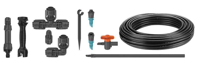 A készlet tartalmaz egy 1000-es alapkészüléket, egy szerelőszerszámot, egy 360°-os szórófejet, két T-idomot 13 mm (1/2"), két L-idomot 13 mm-es (1/2"), három 13 mm-es tömítődugót ( 1/2" ), négy szórófej 90°-ban, öt szabályozószelep 4,6 mm (3/16"), öt hosszabbítócső a szórófejekhez, 15 csőtartó 13 mm (1/2") és egy 25 m hosszú összekötő cső 13 mm (1/2").