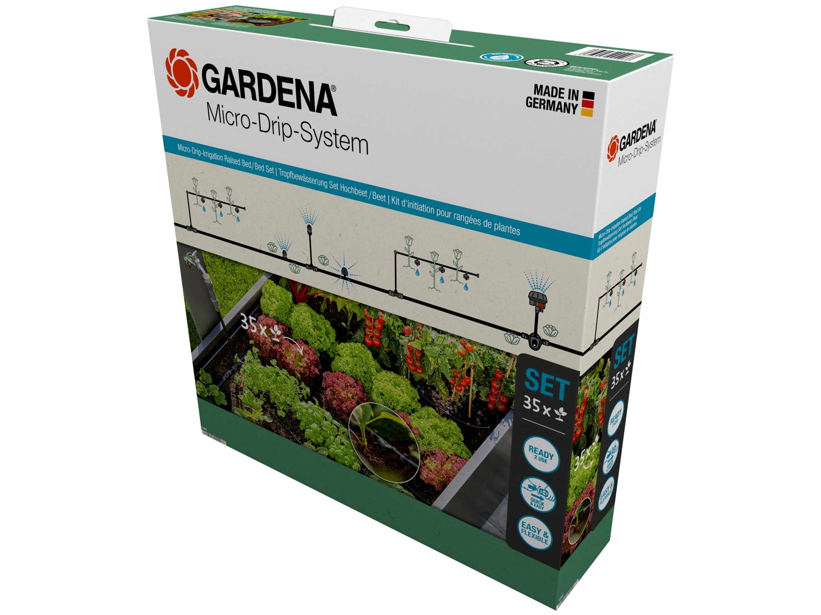 A GARDENA mikro-cseppöntözéses emelt ágya/ágyszettje ideális az emelt ágyás vagy ágyás megbízható és víztakarékos öntözéséhez. A készlet tartalmazza az összes olyan alkatrészt, amelyre szüksége van akár 35 kerti növény, például paradicsom vagy fűszernövények víztakarékos öntözéséhez. A csepegtető öntözés különösen a kényes ágyás növények és palánták számára előnyös. A Ready-2-Use készletet néhány egyszerű lépéssel telepítheti. Az alkatrészek könnyen csatlakoztathatók és leválaszthatók. A praktikus újrafelhasználhatóságnak köszönhetően a Micro-Drip-System fenntartható. A készlet ideális vízmennyiséget biztosít a növények számára, akár különböző magasságokban is. A készletet további MDS alkatrészekkel bővítheti. Például használja a Water Control Select-et (cikkszám: 1891-20) a még hatékonyabb vízellátás érdekében. Ön beállít egy ütemtervet, és az ágya megbízhatóan automatikusan öntözött, még távollétében is. Micro-Drip-System. Gondoskodjon növényeiről és minden értékes cseppjéről. Könnyű, pontos, víz- és időtakarékos öntözés.- 1x Master Unit 1000