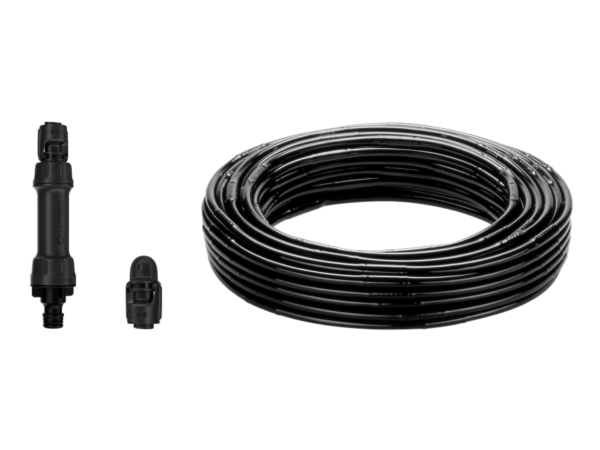 A készlet azonnal használatra kész, mivel minden szükséges alkatrészt tartalmaz. Az integrált csepegtetőfejekkel ellátott csepegtetőcsövet három egyszerű lépésben kell felszerelni - csatlakoztassa a csaphoz, tekerje le és rögzítse csőtartókkal (cikkszám: 13208-20).