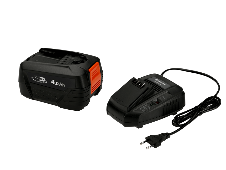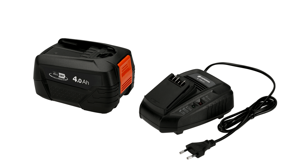 Ez az akkumulátor-készlet a GARDENA AL 1830 CV gyorstöltőjéből és egy 4,0 Ah kapacitású POWER FOR ALL akkumulátorból áll.