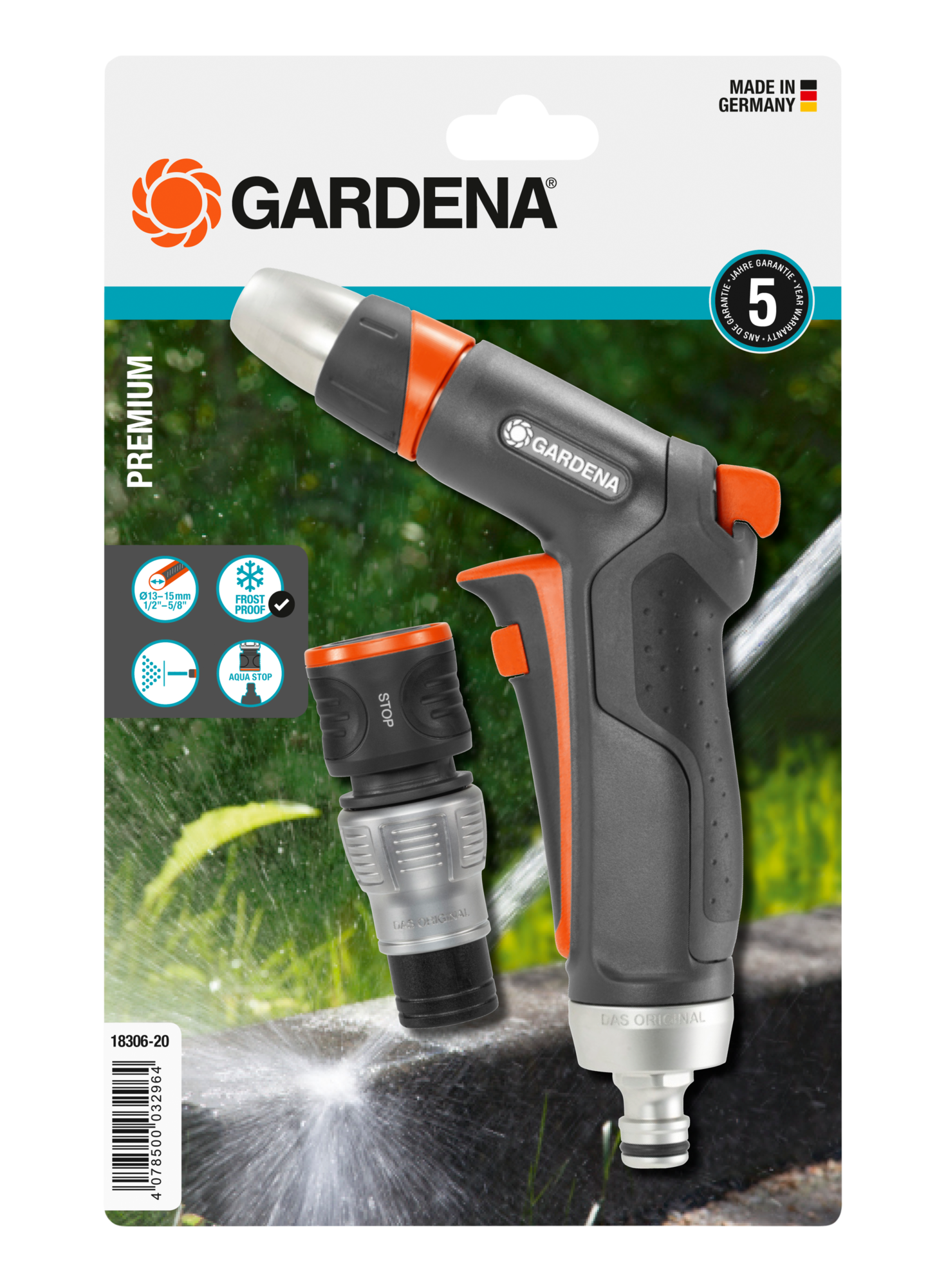 A robusztus GARDENA Premium tisztító fecskendő alkalmas tisztítására és öntözésére. A vízáramlás folyamatosan beállítható. Állandó öntözéshez a trigger gomb lezárható, hogy megakadályozza a kéz fáradtságát. A prémium vízmegállóval ellátott készlet.