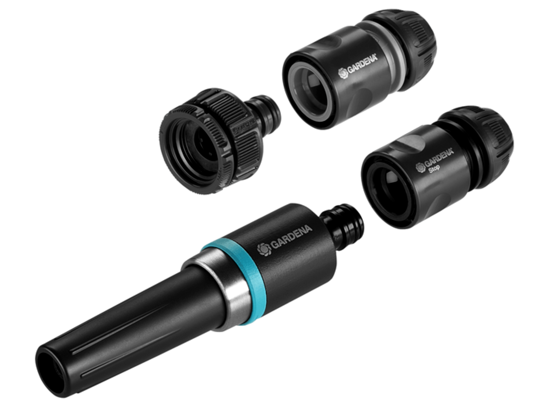 Az EcoLine alapkészlet csapcsatlakozóval, adapterrel, tömlőcsatlakozóval és tisztítófúvókával vízleállítóval két különböző szórással rendelkezik: egy sugárral a tisztítási munkákhoz és egy gyengéd szórással a kerti öntözési feladatokhoz. A szóráskép fokozatmentesen állítható.