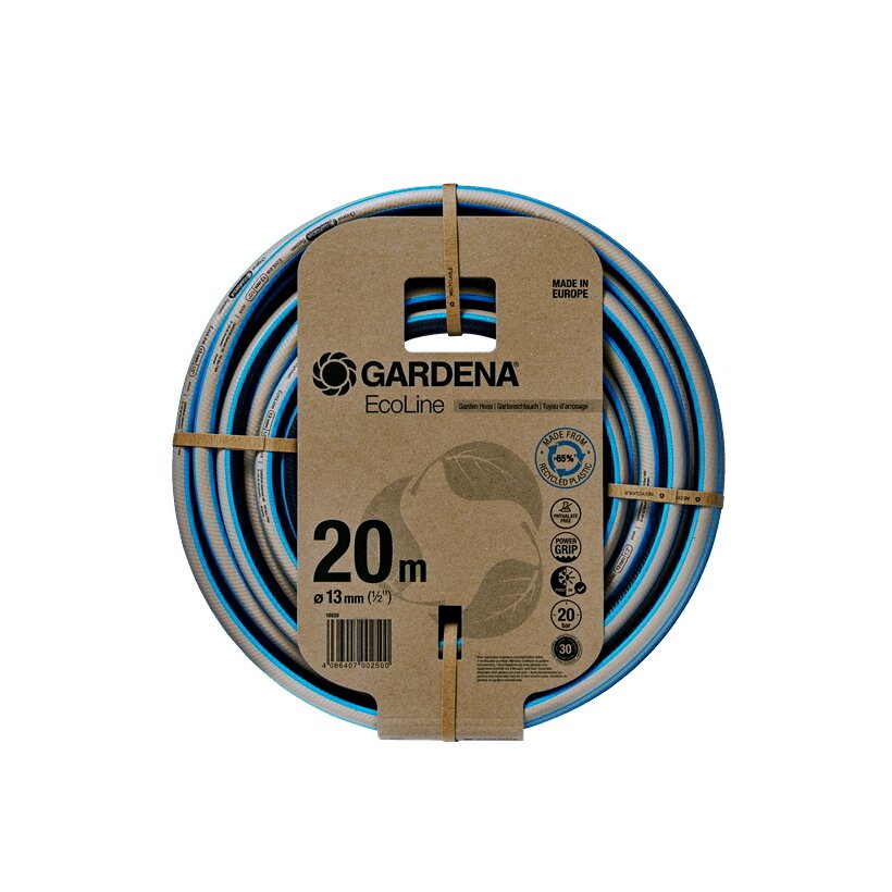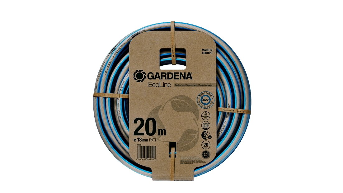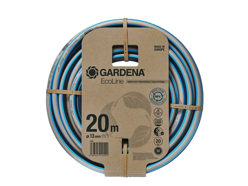 A fenntartható GARDENA EcoLine 13 mm-es (1/2") tömlő a környezetbarát kerti öntözéshez vezető út. A 20 m hosszú tömlő TPE anyagból készült. A felhasznált műanyag több mint 65%-ban újrahasznosított anyagból, főként háztartási hulladékból, például csomagolásból készül. Így a tömlő segít aktívan óvni a környezetet. Nem tartalmaz ftalátokat és káros anyagokat (< 0,1%). A Power Grip bordázat stabil csatlakozást és optimális tartást biztosít a tömlő és a szerelvények között. A tömlő jól mozgékony, könnyű, és kényelmesen tárolható egy tömlőskocsin. Mivel a tömlő UV- és fagyálló, egész évben a szabadban tárolható. A tömlő szakítószilárdsága 20 bar. A GARDENA EcoLine 13 mm-es (1/2") tömlő egy fenntartható és tartós, Európában gyártott minőségi termék. Természetes választás a szenvedélyes kertészek számára. Az új EcoLine termékcsalád. Fenntarthatóan készült. Esztétikusan megtervezett. Tartósan épített.