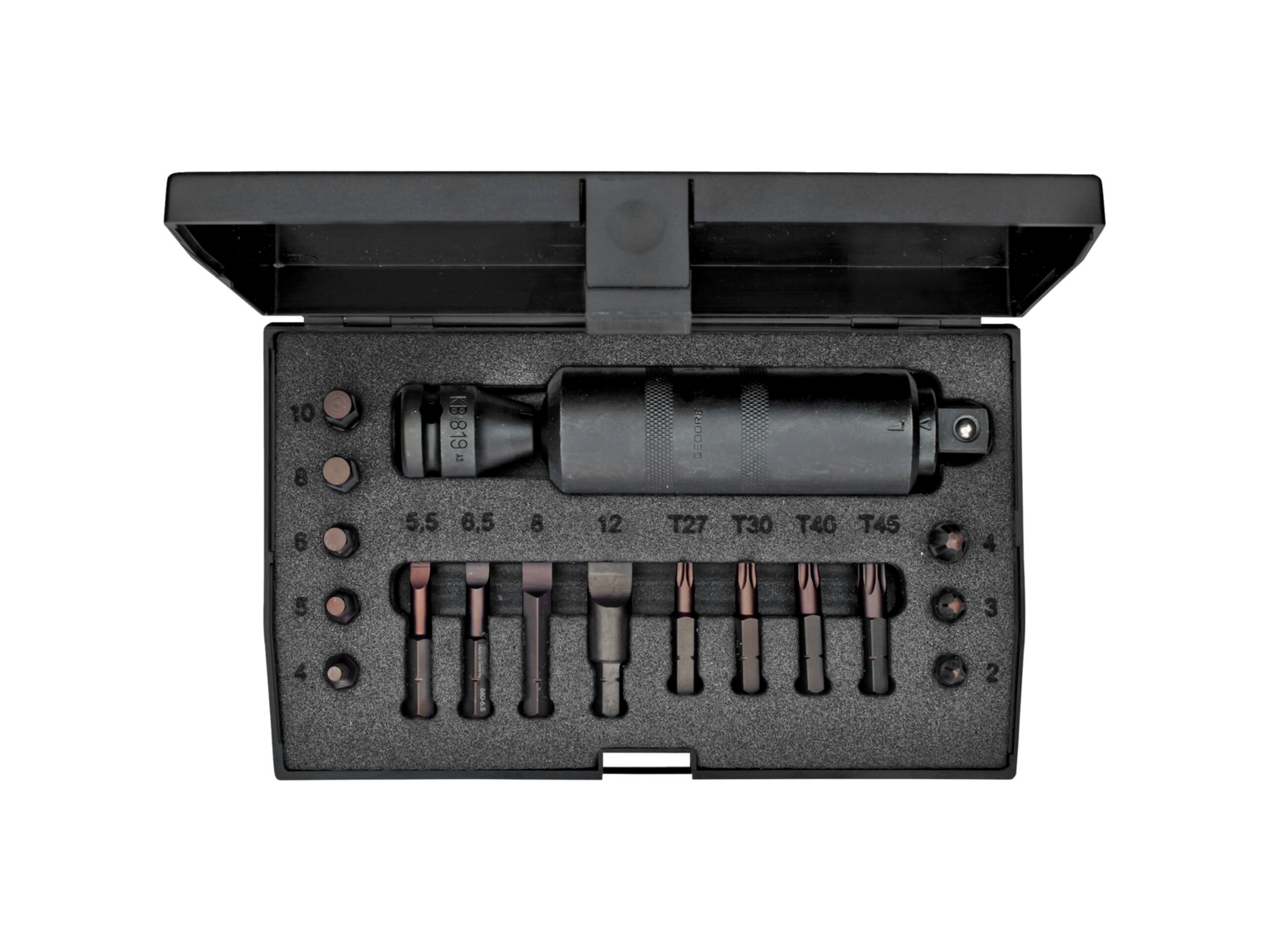 - Kalapácsos csavarhúzó az elakadt csavarok meglazításához, megfordítható jobb és bal kézzel történő működtetéshez.
