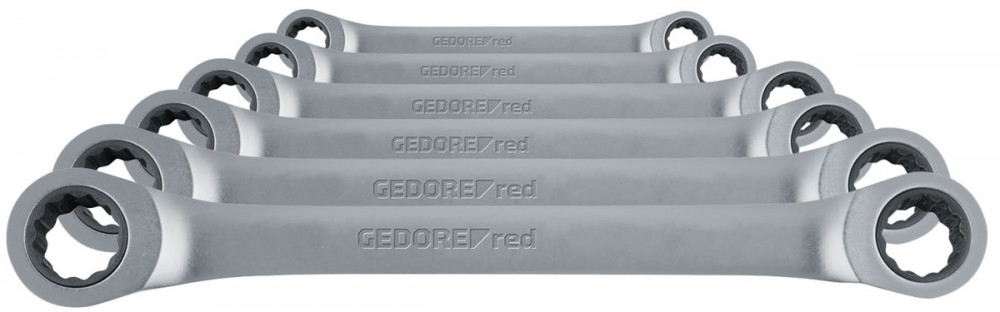 A Gedore Red R07405006 dupla gyűrűs racsnis kulcskészlet 6 darab, mindkét oldalon különböző kulcsszélességű, gyűrűs racsnis kulcsot tartalmaz egy tartóban. A racsnis fej egyenes. A racsnis mechanizmus finom fogazású, 72 foggal, a visszahajlási szög mindössze 5°. A kulcsok króm-vanádium acélból készülnek, és matt krómozott felületűek. Az R07405006 készlet a DIN 3113, ISO 3318 szabvány szerint készül, és a szokásos méreteket tartalmazza praktikus kombinációban.