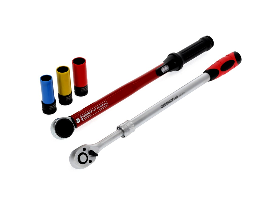 A készlet tartalmazza az R68900200 nyomatékkulcsot az ellenőrzött és precíz csavarhúzáshoz 40-től 200 Nm-ig, valamint az R60010027 teleszkópos racsnit, amely kényelmesen fogható, és öt fokozatban könnyedén meghosszabbítható 460 mm-ről 600 mm-re. A szintén mellékelt R63043003 elektromos villáskulcs-készlet GEDORE piros kivitelben 3 db dugókulcsot tartalmaz a gép működtetéséhez. Egy zárógyűrű/csap tartja a helyükön.