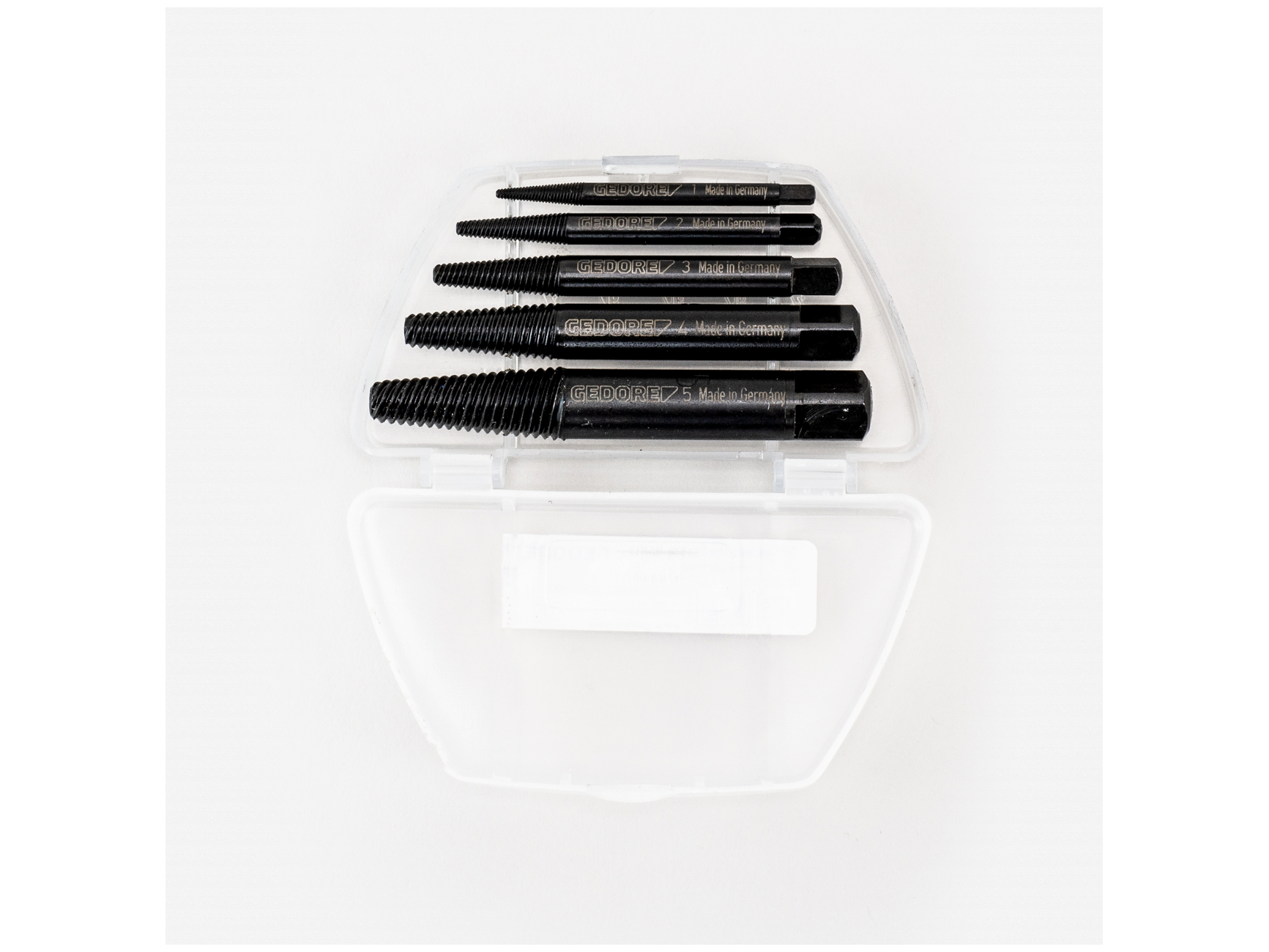 A GEDORE 6759620 5 darabos csavarhúzó készlet M3 – M18 méretű csavarhúzókat tartalmaz. A leszakadt csavarok és a körbefordított csavarfejek olyan kellemetlenségek, amelyekkel minden kézművesnek előbb vagy utóbb foglalkoznia kell. De van megoldás erre a problémára: a csavarhúzó. Ha a csavar eltörik, akkor az extraktorral eltávolíthatja, anélkül, hogy a szál megsérülne. A 6759620 csavarhúzó készlet króm-vanádium acélból (35 HRC) készült, és praktikus műanyag összecsukható dobozban található.