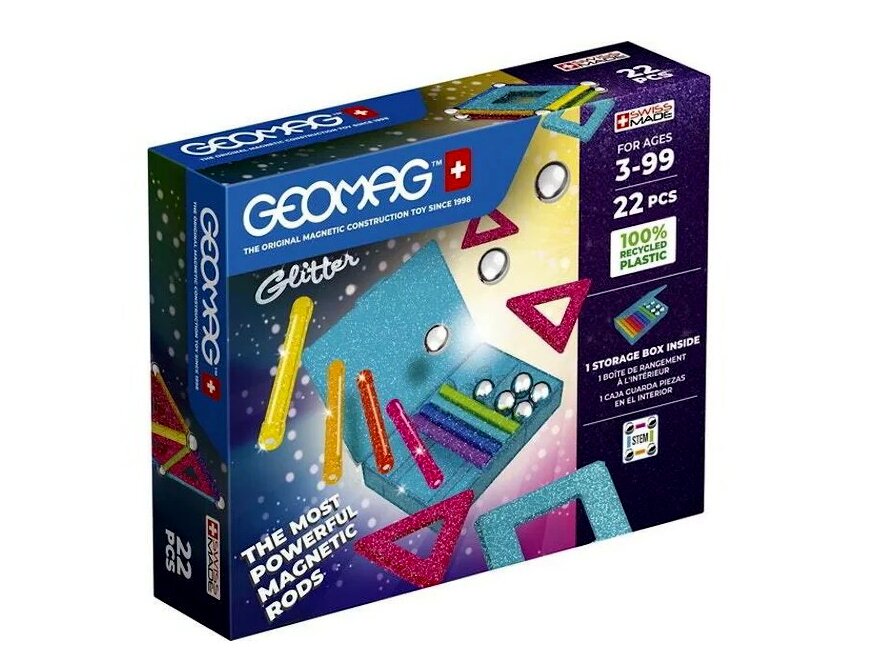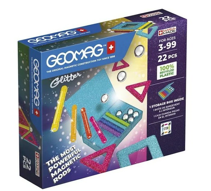 A Geomag Glitter termékcsalád bájos, fényes színeivel és izgalmas csillogásával elvarázsolja a kicsiket és nagyokat egyaránt. A készlet 100%-ban újrahasznosított műanyagból készült, amely lehetővé teszi, hogy játék közben is hozzájáruljunk a környezetvédelemhez.