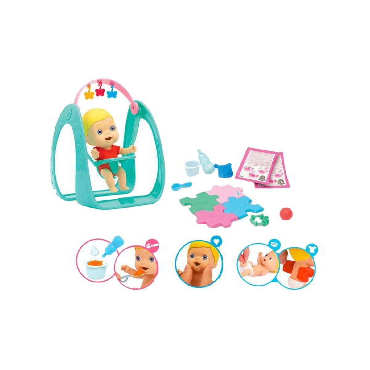 Ez a kis játékszett egy csörgőkkel díszített hintát, puzzle játszószőnyeget, cumisüveget, tényért, kanalat, előkét és más apró kiegészítőket tartalmaz. Mindent, ami egy pici baba gondozásához szükséges.